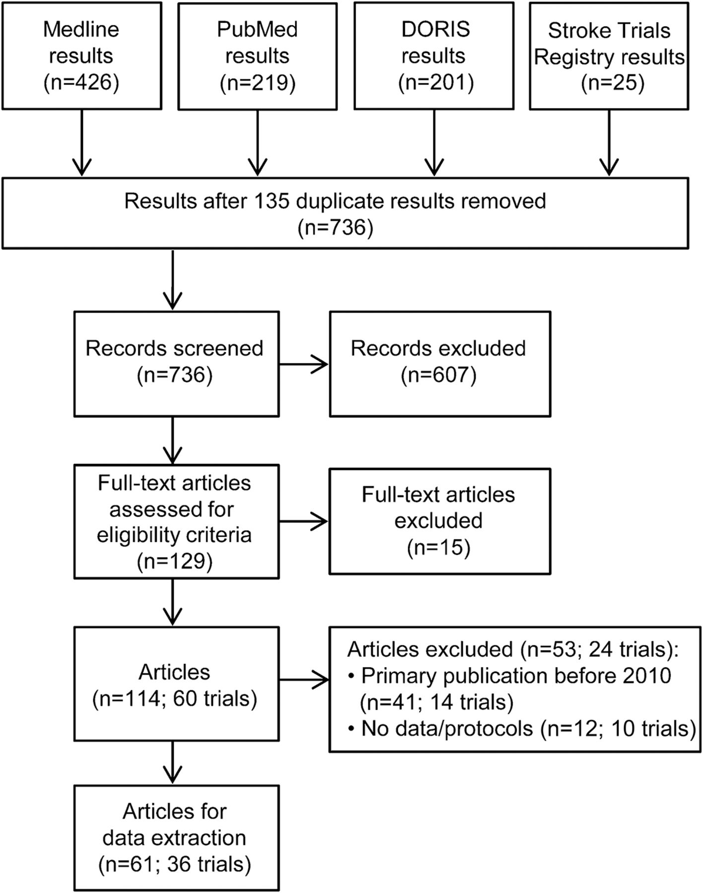 我们搜查了Medline, PubMed Cochrane数据库研究中风(多丽丝),和中风试验注册英语出版物之间的1月1日2010年5月31日,2014年,随机对照试验的结果报告的急性缺血性中风的干预措施。下面的文本和网格计算中使用我们的搜索:Medline:中风(网格计算)和(急性或血管内手术或溶栓治疗或tPA或纤溶酶原激活物或fibrinolys *或血栓切除术或再灌注或再通);PubMed:(急性中风或急性缺血性中风和中风和[血管内手术或溶栓治疗或tPA或纤溶酶原激活物或fibrinolys *或血栓切除术或再灌注血管再通]和[randomiz *或控制]不是Medline);桃乐丝:与限幅急性治疗急性缺血性中风(< 30天)和过滤器相关的和现有的证据;急性缺血性中风临床试验注册中心:主要目的是治疗的过滤器完成研究。这些搜索了871篇文章,其中135是重复的,给736独特的文章(图1改编自棱镜指南)。