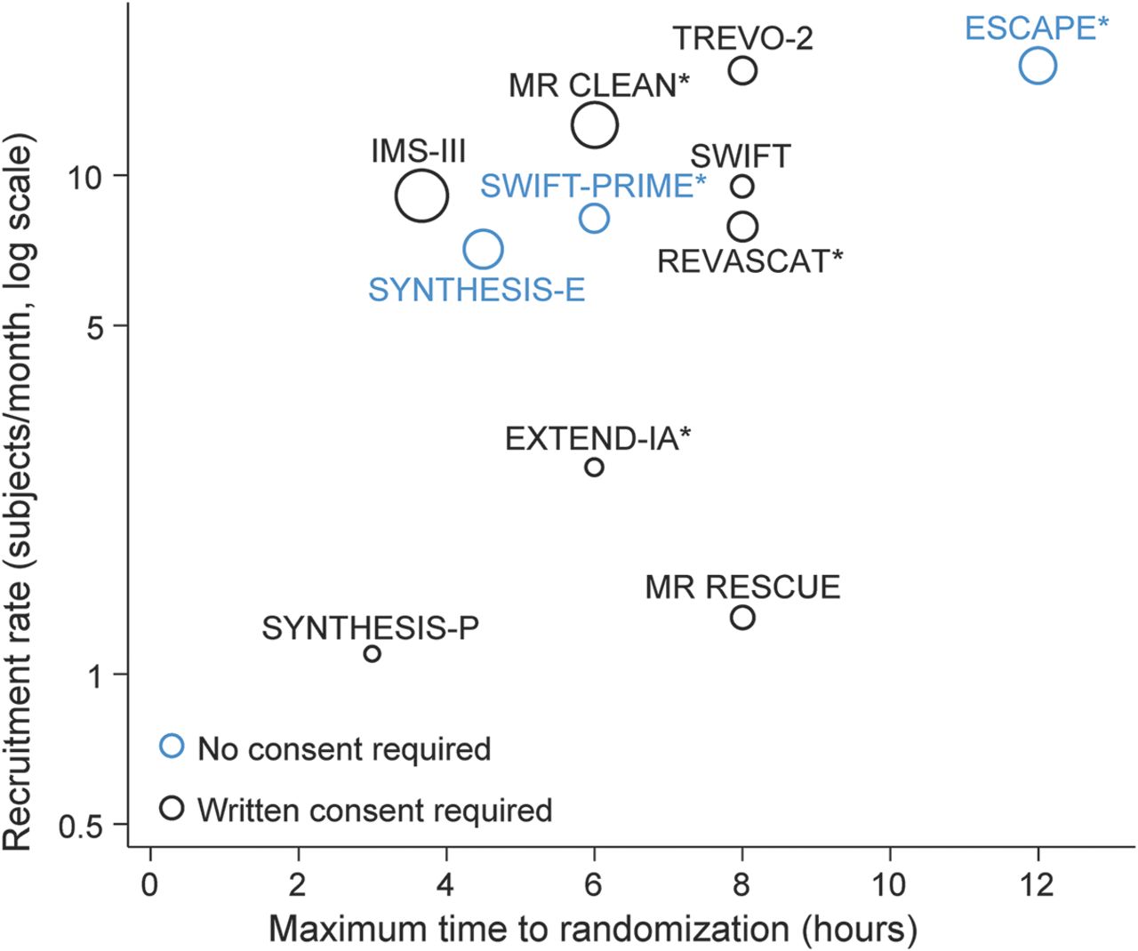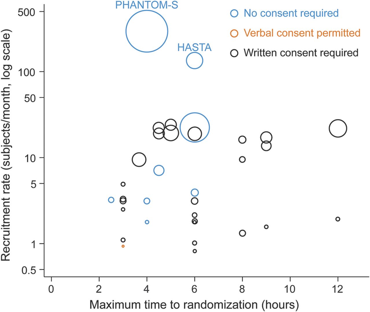 两个潜在的离群值试验确定了(图2)。PHANTOM-S超过21个月,进行招生最多的参与者(6182人)在本文试验中,每月招聘率294.4的参与者。研究超急性中风报警(直到)进行了超过7个月,第四大数量的注册参与者(942人),每月招聘率134.4的参与者。