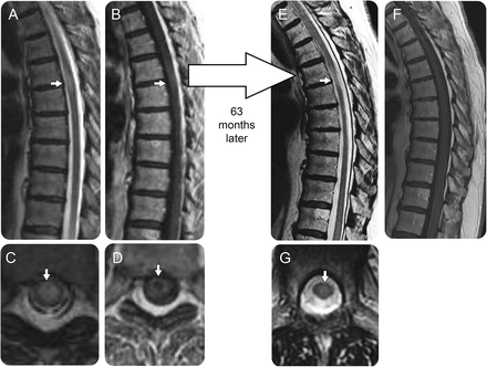 与急性炎症性脊髓病一个56岁的女人,胸椎MRI演示了一个T2-hyperintense病变(箭头),地下线与温和的脊髓水肿在矢状图像,这是位于集中在轴向图像(C,箭头)和相关的轻度环形增强钆政府后,更加突出对轴向(D,箭头)矢状图像(B,箭头)。她从最初的炎症性脊髓病中恢复过来,但是3.5年后发达进步的痉挛性下肢轻瘫,重复MRI 63个月后的首次脊髓炎集透露苹果核心萎缩性T2-hyperintense病变(E,箭头)与中央T2 hyperintensity残余轴向图像(G,箭头)的决议之前钆增强矢状(F)和轴向(图像不可用)postgadolinium序列。