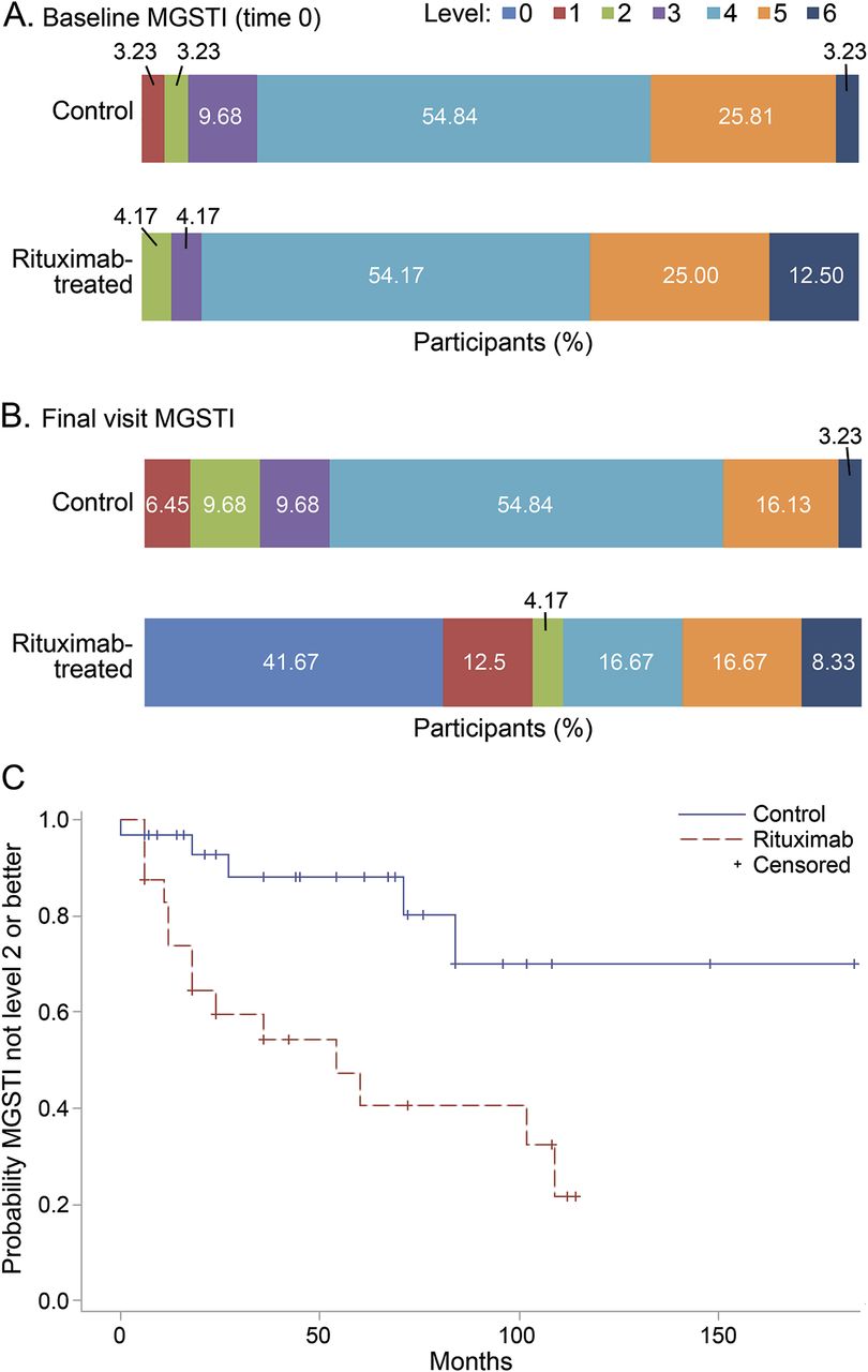 百分之五十八的病人在利妥昔单抗的手臂达到主要结果(MGSTI 2级或更好)在最后访问控制的16%(相比p= 0.002)(表2)。观察1的平均MGSTI利妥昔单抗的手臂相比MGSTI 4中值控制(p= 0.02)。kaplan meier生存分析确定平均时间达到一个MGSTI 2级或更好的54个月的利妥昔单抗的手臂(p= 0.005);中位数时间取得主要结果控制无法计算,因为只有不到50%的患者达到这个端点(图3)。需要治疗人数达到2.4最后的访问是主要的结果。