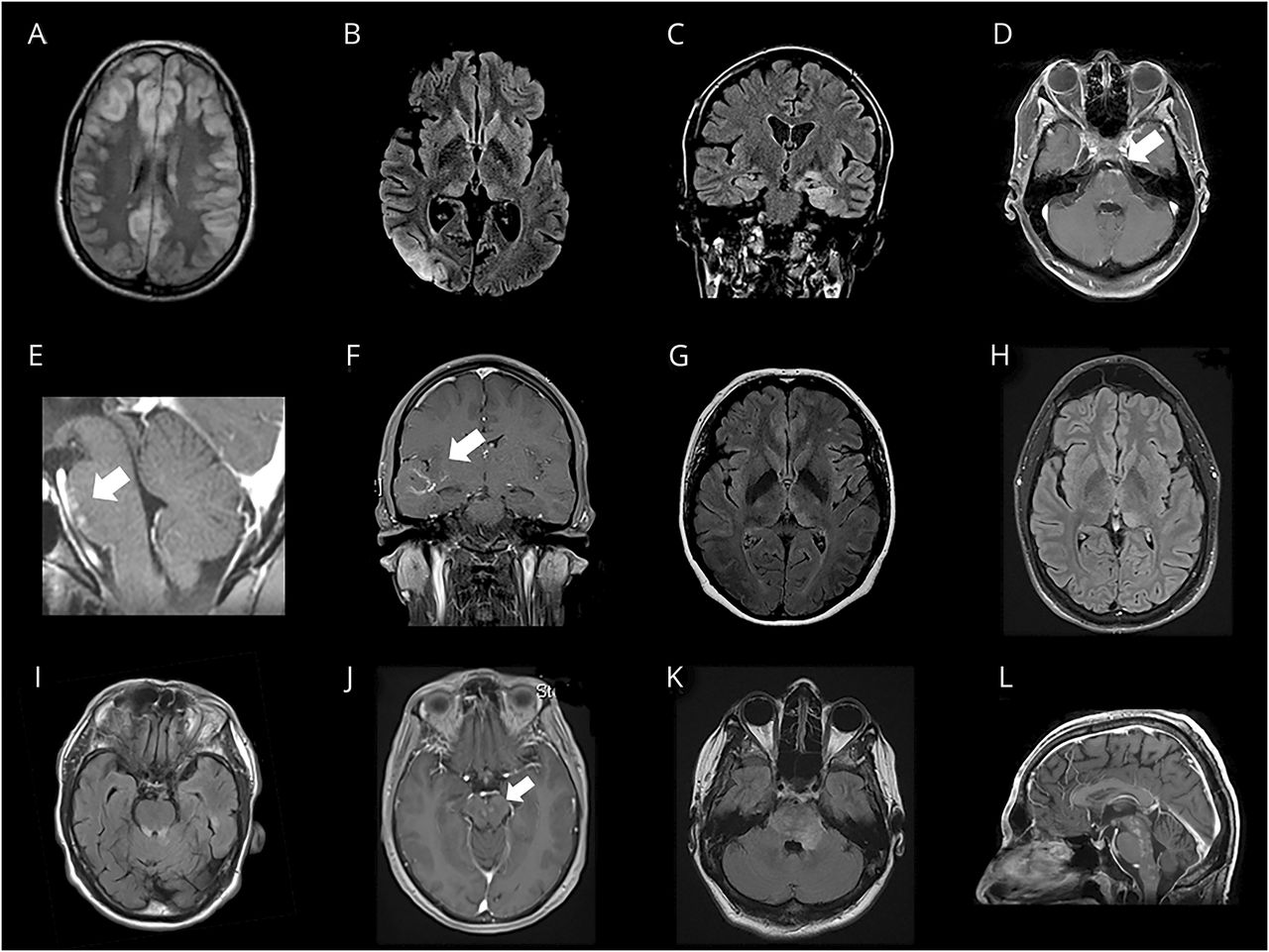 (A, B)双边和单边皮质病变在天赋序列。(C) Temporomesial皮质病变模仿边缘脑炎天赋序列。(D-F)桥的皮质leptomeningeal钆增强。(G, H)丘脑病变天赋序列。(i (k)脑干病变涉及脑桥和中脑被盖。(左)“盐和胡椒”脑干CLIPPERS-like成像模式。图像(B)和(C)对应于同一病人在疾病的不同阶段(病人2表e - 3links.lww.com/WNL/A473)。快船=慢性淋巴细胞炎症与桥的血管周的增强对类固醇;天赋= fluid-attenuated反转恢复;MOG-Ab =髓少突细胞糖蛋白抗体。