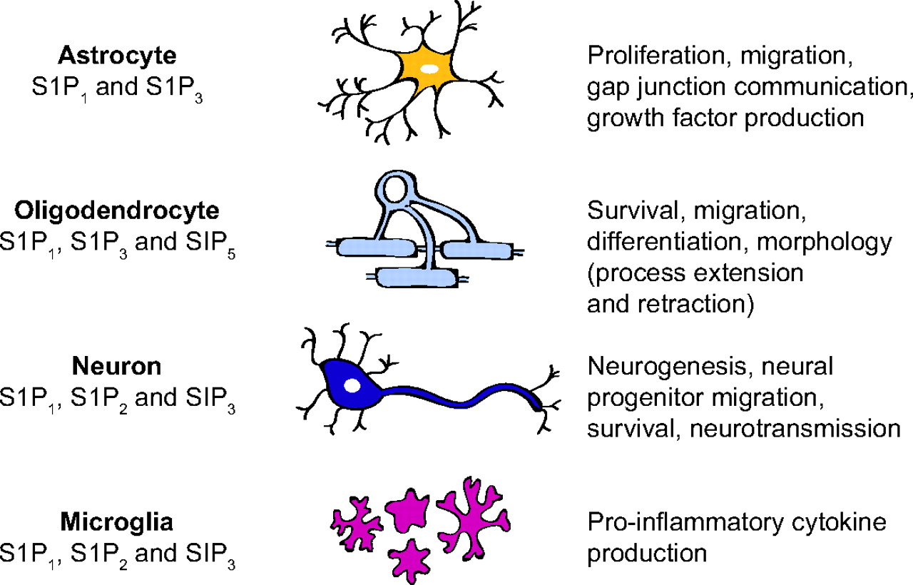 鞘氨醇1-phosphate (S1P),鞘脂类的代谢有重要的信号功能的免疫和心血管系统和中枢神经系统,通过5 G protein-coupled受体亚型介导,S1P1 - 5。所有S1P受体(S1PRs)表达在中枢神经系统。如图,少突胶质细胞主要表达S1P1和S1P5,1,2和星形胶质细胞主要表达S1P1和S1P3。3,4所有5受体神经元血统可以表达,而表达S1P小胶质细胞出现1 - 3。5星形胶质细胞和神经元释放S1P已被证明。在这里,我们总结的角色在特定中枢神经系统细胞S1P信号类型,fingolimod的调节效应(FTY720) S1PR信号及其与多发性硬化症(MS)。