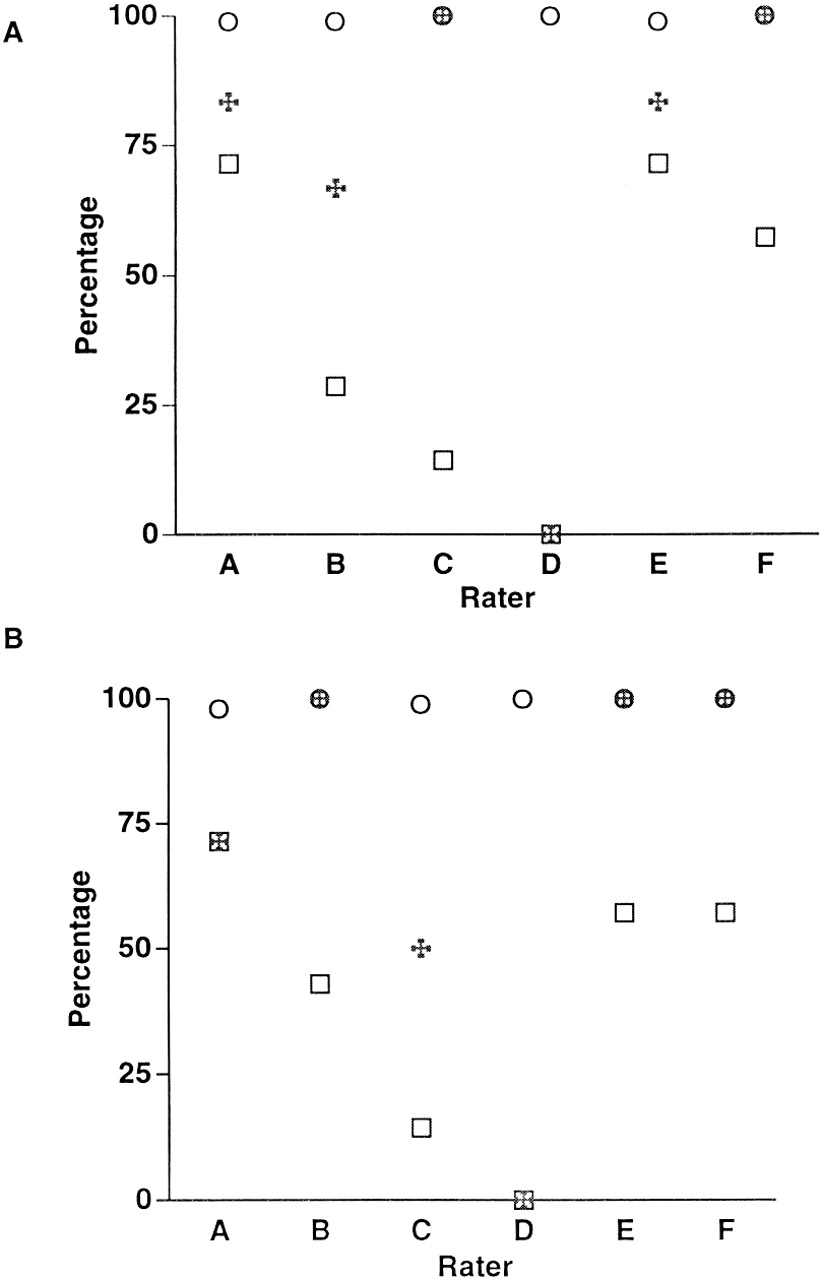 图。临床诊断的有效性选择的六个评级机构(f)姓(A)和(B)诊所访问。□,个体敏感性;○特异性;(重希腊十字),阳性预测值。评定等级的平均敏感度(40%)是一样的。在第一次访问的平均特异性(99.4%,95.4%在最后访问)和阳性预测值(72%在第一次访问中,70%在最后访问)改变了只有最低限度从第一次到最后一次访问。访问的平均时间间隔是25个月。