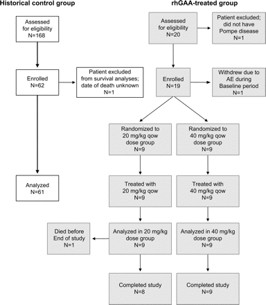 它被认为是不道德的,包括安慰剂组作为研究设计的一部分,有以下原因:1)infantile-onset筛疾病迅速致命的障碍和2)早期临床试验表明,用各种形式的rhGAA治疗可以改善生存,心脏和呼吸功能,严重影响婴儿的增长,汽车发展。7 - 11因此,历史对照组61严重影响婴儿6个月大,年轻被确认通过应用研究纳入和排除标准的一组168例infantile-onset筛疾病通过了回顾性的图表总结确定。6队列包括来自9个国家的168名患者,33个不同的网站,与出生日期从1985年到2002年之前。6药物对整体存活率的影响(有或没有呼吸机使用)和入侵ventilator-free生存患者和治疗这一历史队列之间的比较;18我们组治疗患者提供了> 98%电力检测治疗,对照组的区别。表1总结了筛选标准应用于原始历史的患者人群为了让病人被纳入历史控制子群。