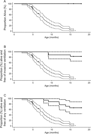 图2。(一)kaplan meier估计的时间从出生到死亡日期。三个病人right-censored分析(年龄在14.4,15.9,和17.9个月),因为他们没有满18个月的研究中,虽然他们仍然活着。(B) kaplan meier估计的时间从出生到入侵通风机使用或死亡。两个病人right-censored从这个分析(年龄在15.9和17.9个月),因为他们没有满18个月的研究中,虽然他们仍无任何通气支持。一个病人没有满18个月的研究结束需要侵入性通气支持,因此不是right-censored但是失败被指定为这个端点。(C) kaplan meier估计的时间从出生到任何通风机使用或死亡。两个病人right-censored从这个分析(年龄在15.9和17.9个月),因为他们没有满18个月的研究中,虽然他们仍无任何通气支持。一个病人没有满18个月的研究结束需要通气支持,因此不是right-censored但是失败被指定为这个端点。在每一个面板中,厚的实线显示kaplan meier估计病人治疗组; thin solid lines show those for the historical control group, with 95% CIs given by the corresponding dashed lines. Solid circles indicate right-censored observations. *Asterisk indicates that one patient from the historical control group remained alive at 18 months of age; this patient died at age 44 months。