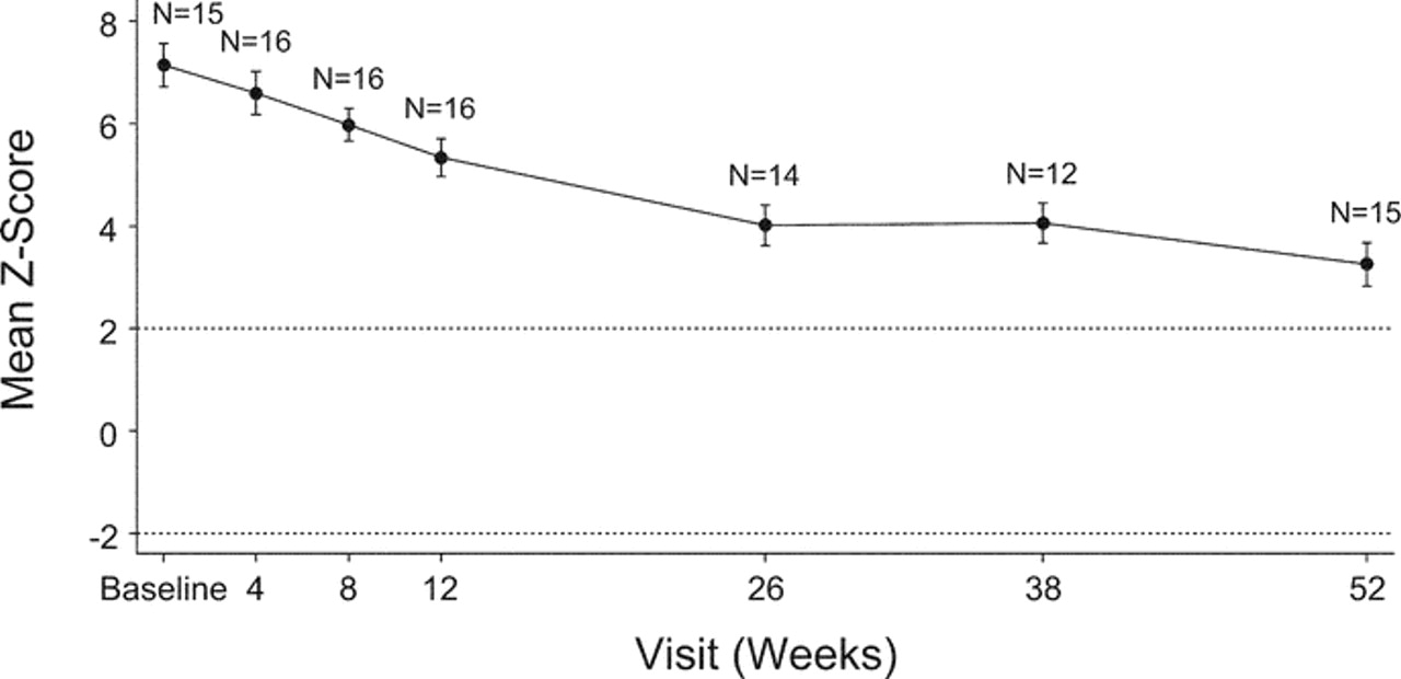 所有患者超声心动图心肌病在招生的证据。附加的超声心动图进行基线和星期4,8日,12日,26日,38岁,52岁。基线左心室质量指数的平均值为193.4 g / m2(n = 15;范围59.3 ~ 301.8 g / m2)。在52周,意味着左心室质量指数下降了86.8 g / m2(n = 15;范围44.9 ~ 157.3 g / m2)。治疗降低左心室质量早在星期4,总结了图3,这表明,意味着左心室质量Z评分从基线值7.1降低到了3.3的52周治疗期结束。