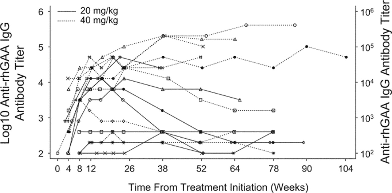 血清样本被每个输液前从起始治疗24周,随后在38周,52岁,64年,78年、90年和104年。正如上面所讨论的,不同患者不同时间的rhGAA治疗,从52到106周,这取决于当他们参加这项研究。免疫球蛋白抗体的存在rhGAA评估使用酶联免疫吸附试验和使用radioimmunoprecipitation证实,所述Kishnani et al。11