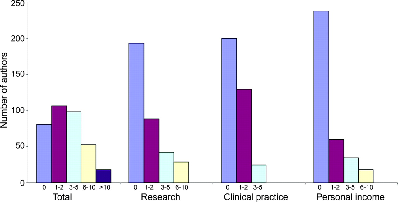 的图显示了每个作者的个人coi数类型的冲突。近50%的作者有三个或三个以上总coi (n = 98 3 - 5 (28%), n = 53与6 - 10(15%)和n = 18 > 10 [5%])。少数作者有六个或更多个人研究(n = 29, 8%)或个人收入coi (n = 18, 5%)。