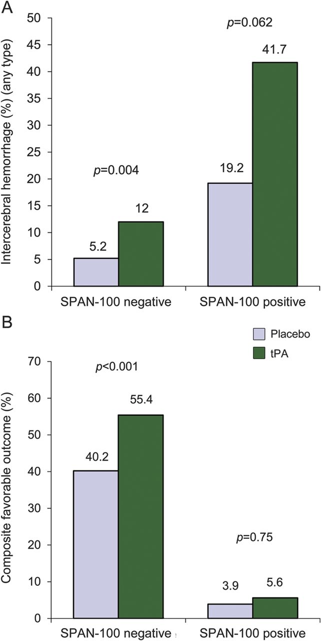 结果:在研究所试验624例中,62例(9.9%)受试者跨度- 100阳性。在那些接受tPA,我跨越- 100阳性患者的自杀率很高(42% vs 12%跨越- 100 -病人;p< 0.001);同样,我跨越- 100阳性患者的自杀率很高(19% vs 5%;p= 0.005)那些不接受tPA。跨越- 100与较差的预后有关。tPA的好处,定义为良好的复合结果为3个月,出现在跨- 100 -患者(55.4% vs 40.2%;p< 0.001),但不能跨越- 100阳性患者(tPA 5.6% vs 3.9%;p= 0.76)。二次结果发现了类似的趋势(如出血症状,灾难性的结果,出院回家)。