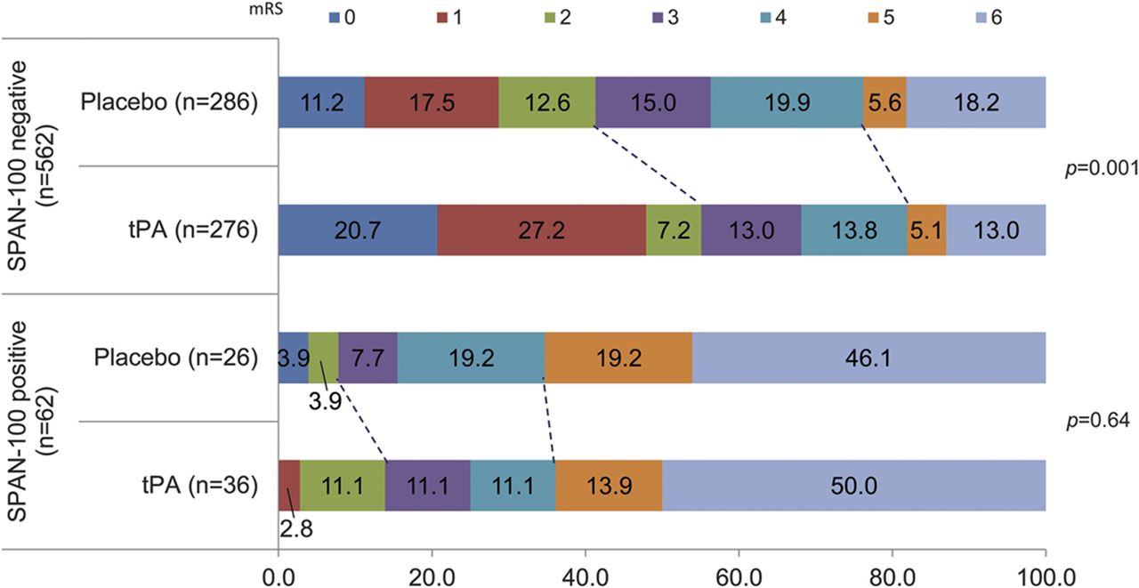 与安慰剂相比,跨- 100 -接受tPA的病人更有可能出院(49.6% vs 34.6%;p< 0.001,例数十分7)。相反,没有观察到好处与tPA跨度- 100阳性患者(8.3% vs 11.5%;p= 0.67)。跨度接受tPA - 100阳性患者有更高的死亡率比跨越3个月- 100 -患者(50.0% vs 13.0%;p< 0.001,NNH 3)。其他次要功能结果报告表2。