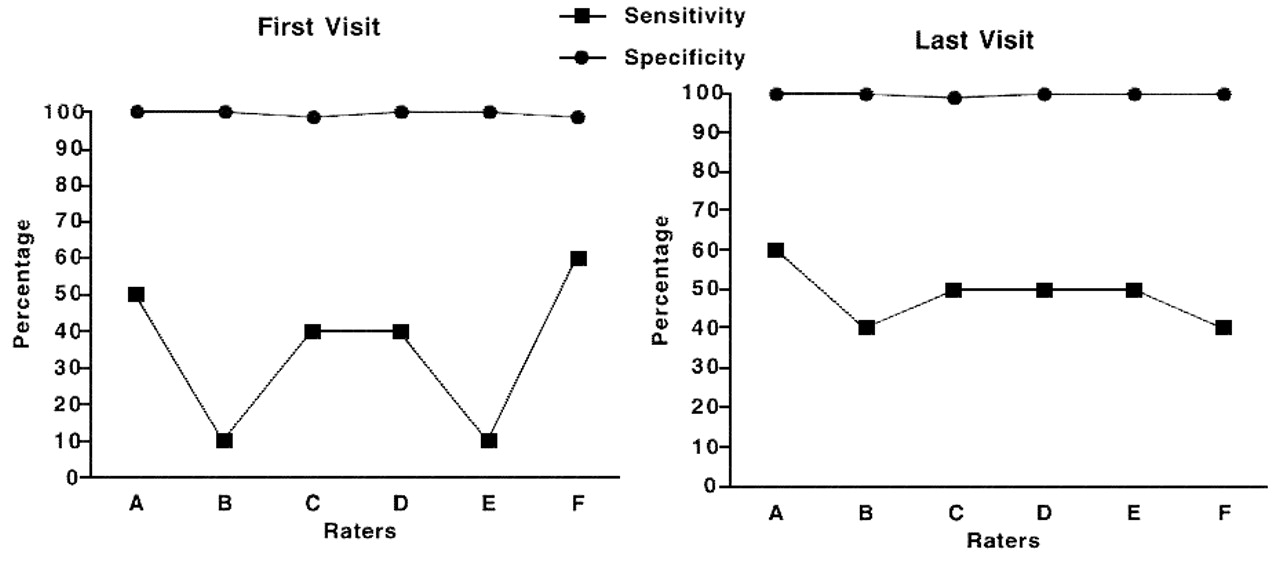 评级机构的敏感性不同的第一次访问(p < 0.01,科克伦问);总的来说,比初中高级神经学家发现更多的病例。没有差别的敏感性之间的第一个和最后一个访问任何评定等级。