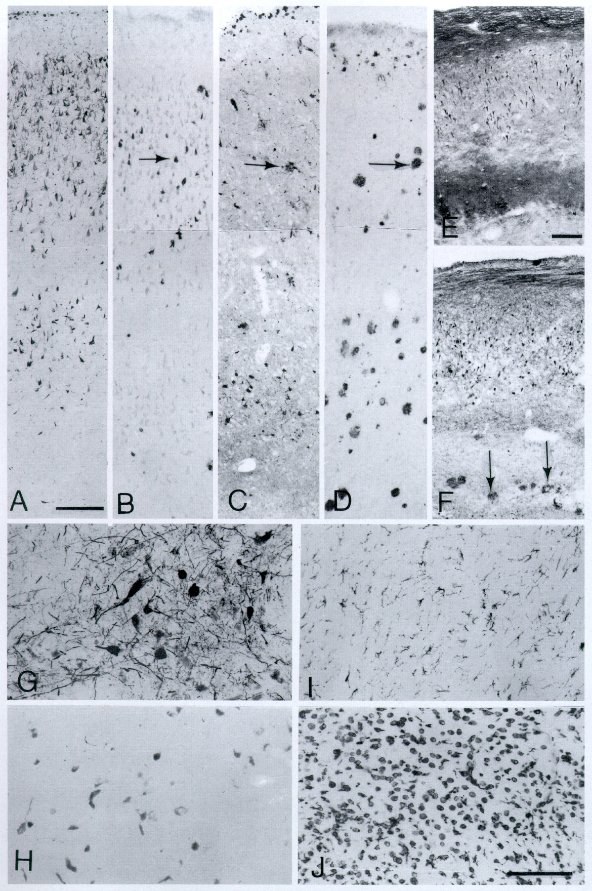 图1所示。疣状揭示对比bodig lytico, Alzheimer-type病理学。(模拟)B4的occipitotemporal皮层组织化学染色严重bodig案例(a, B)与B7相比,bodig案件复杂化广告(C, D)。a, C,疣状与anti-ubiquitin做神经原纤维缠结揭示(非功能性测试)。B, D,疣状anti-β-amyloid蛋白质R17揭示老年斑和tangle-associated淀粉样沉积(TAADs)。注意在B4的存在大量的非功能性测试,尤其是在supragranular第二和第三层,而B,沾染了R17附近的一个部分,演示了只有分散TAADs。注意,在比B4 C B7显示更少的非功能性测试,与一个更大的比例出现在染色后的infragranular层诉forβ-amyloid蛋白质(D)、B7显示许多老年斑广告的特点。箭头指向的例子。(E) Bielschowsky染色的海马体在CA-1 B12显示许多非功能性测试。(F) Bielschowsky染色的海马体,以防B7显示CA-1同类非功能性测试以及许多老年斑在齿状回分子层(箭头)。(G H)比较Alz-50疣状的黑质致密部bodig (B4)和lytico (L2)。 (G) B4 shows many NFTs and abnormal neurites in melanized neurons. (H) L2 shows no Alz-50 positive staining. (I, J) Comparison of HLA-DR (CR3/43) immunostaining of the pyramidal tract section of the cerebral peduncle in bodig (B10) and lytico (L2). (I) B10 shows inactive microglia. (J) The comparable region in L2 is filled with lipid laden microglia/macrophages. Bars in A, E and J = 200 µm; A-D, E and F, and G-J are at the same magnifications.