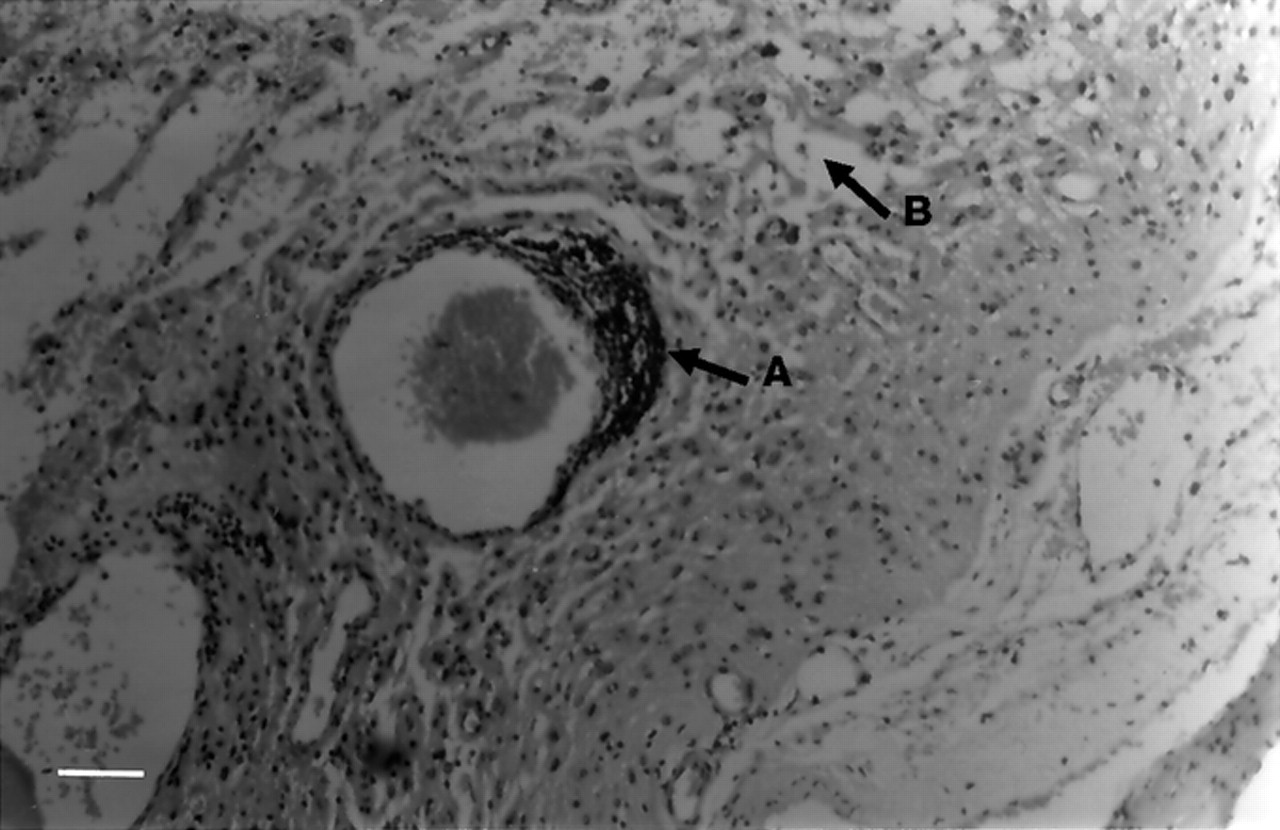 图1所示。额叶皮质活检标本从病人1。(一)淋巴细胞性血管周的成套。(B)空泡的改变引起皮质结构的崩溃。他走时污渍。酒吧= 6.6μm规模。在更高权力的外表显示进一步变化的典型Rasmussen的脑炎,与含有淋巴细胞的炎性浸润,巨噬细胞,小胶质细胞反应性星形胶质细胞和神经元变性的不同阶段(没有显示)。