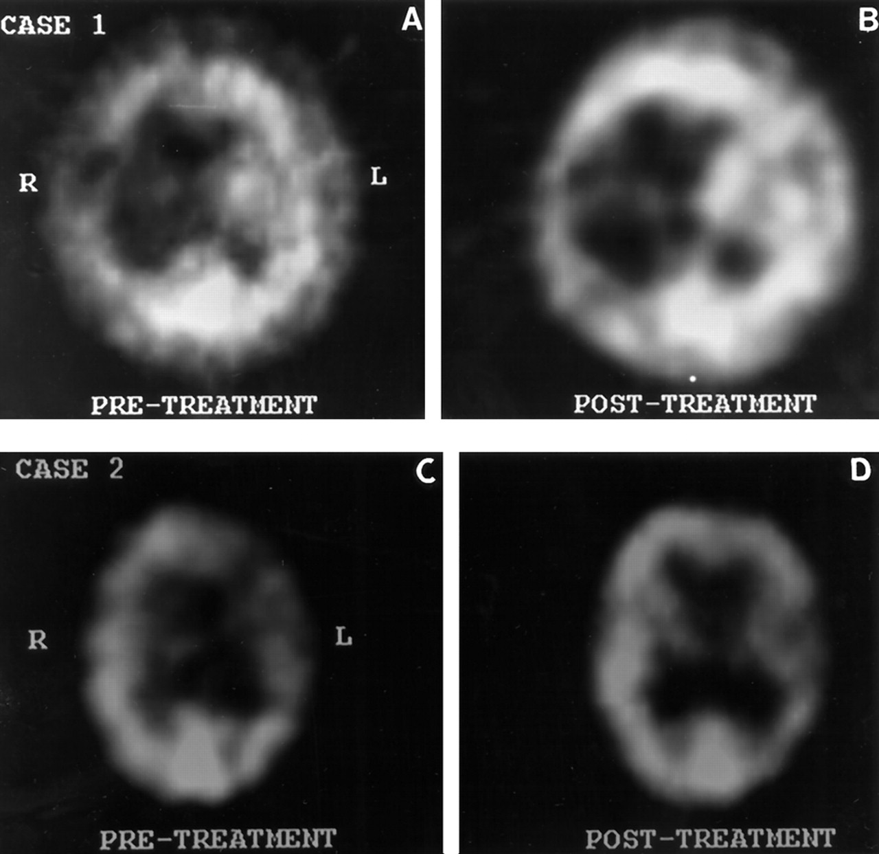 图2。发作横99米科技——netium-HMPAO SPECT图像。(一)病人1之前人类静脉免疫球蛋白(hIVIg)治疗:右额叶和顶叶的低灌注。1 (B)患者18个月后开始hIVIg:右额叶和顶叶灌注的增加大于2 SD与面板a . (C)病人2 hIVIg治疗前:左额叶和顶叶区域的低灌注。(D)病人2 14个月后开始hIVIg:左额叶和顶叶区域灌注的增加大于2 SD C与面板。