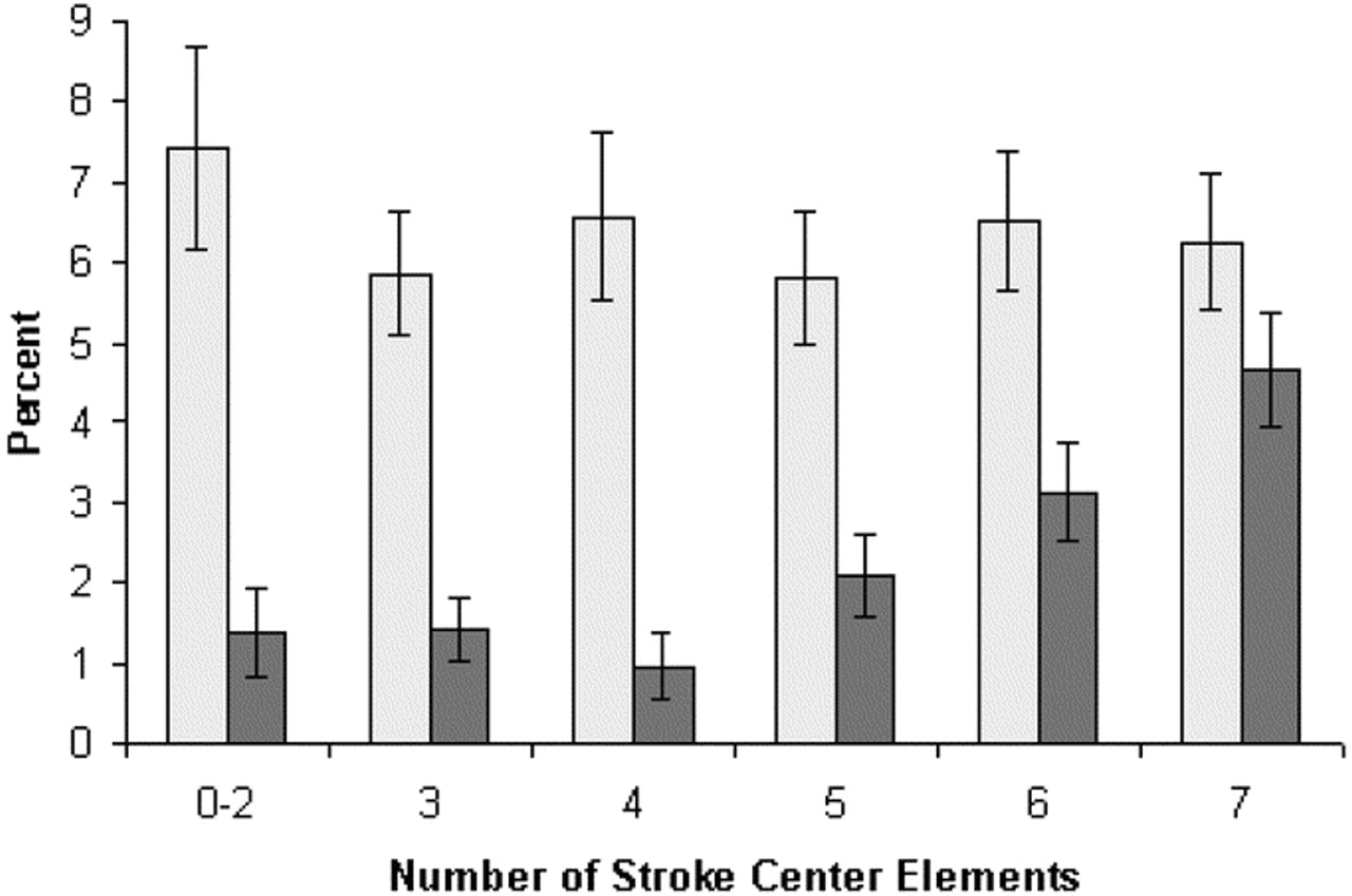 图。许多主要的中风中心元素出现在每个机构和相关的死亡率(浅灰色列)和组织纤溶酶原激活物(tPA)使用(深灰色的列)。只有那些七元素,包括预测增加溶栓。误差线表明95% CIs。多变量测试趋势:tPA使用,p< 0.001;住院死亡率,p= 0.40。