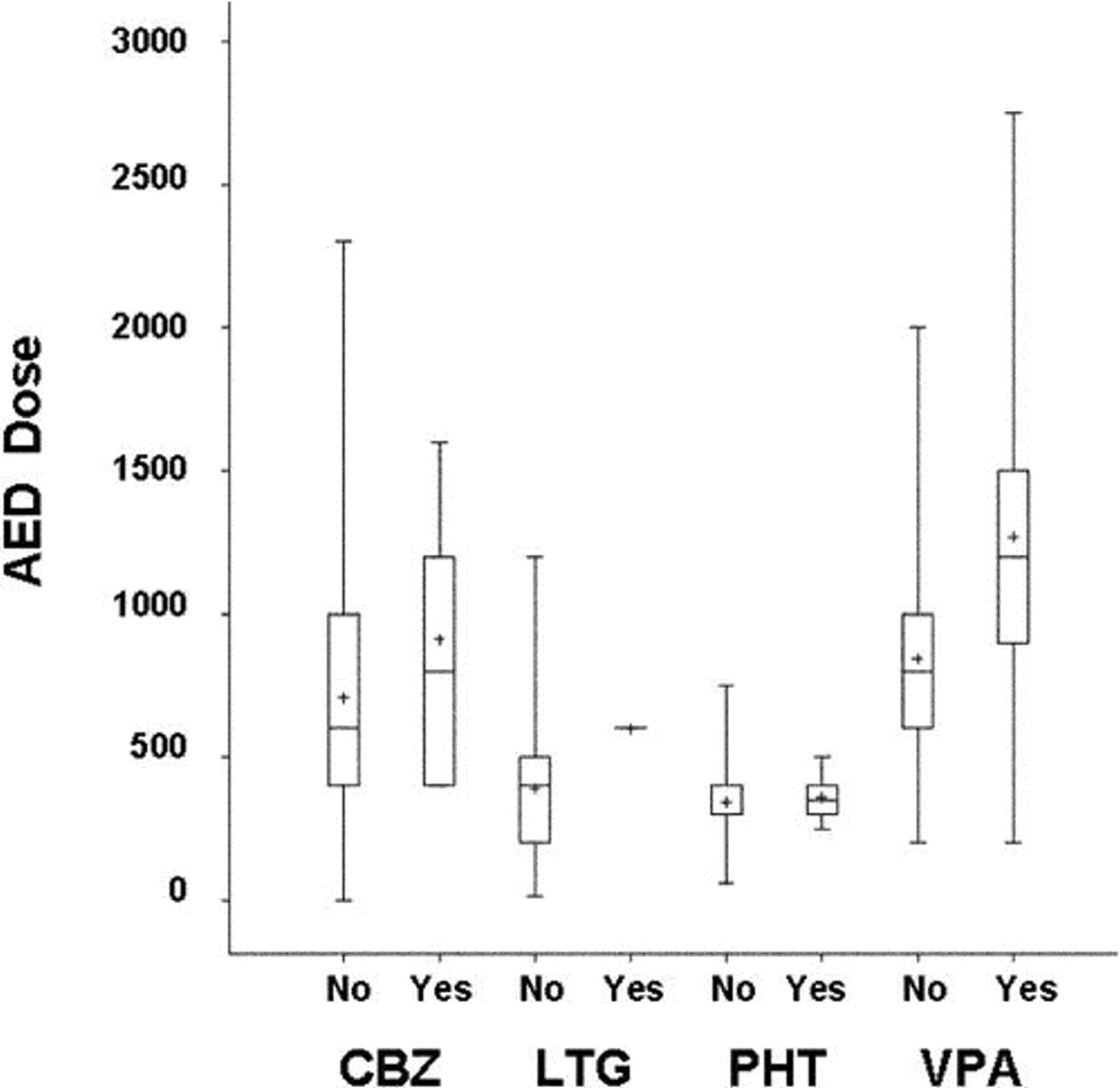 图。抗癫痫药物(AED)剂量和严重不良的结果。怀孕前期AED剂量(毫克/天)没有(没有)或(yes)存在严重不良的结果(即。,胎儿死亡或重大畸形)。盒= 25日通过第75百分位数;水平线=中位数;穿过=意味着;括号=范围。