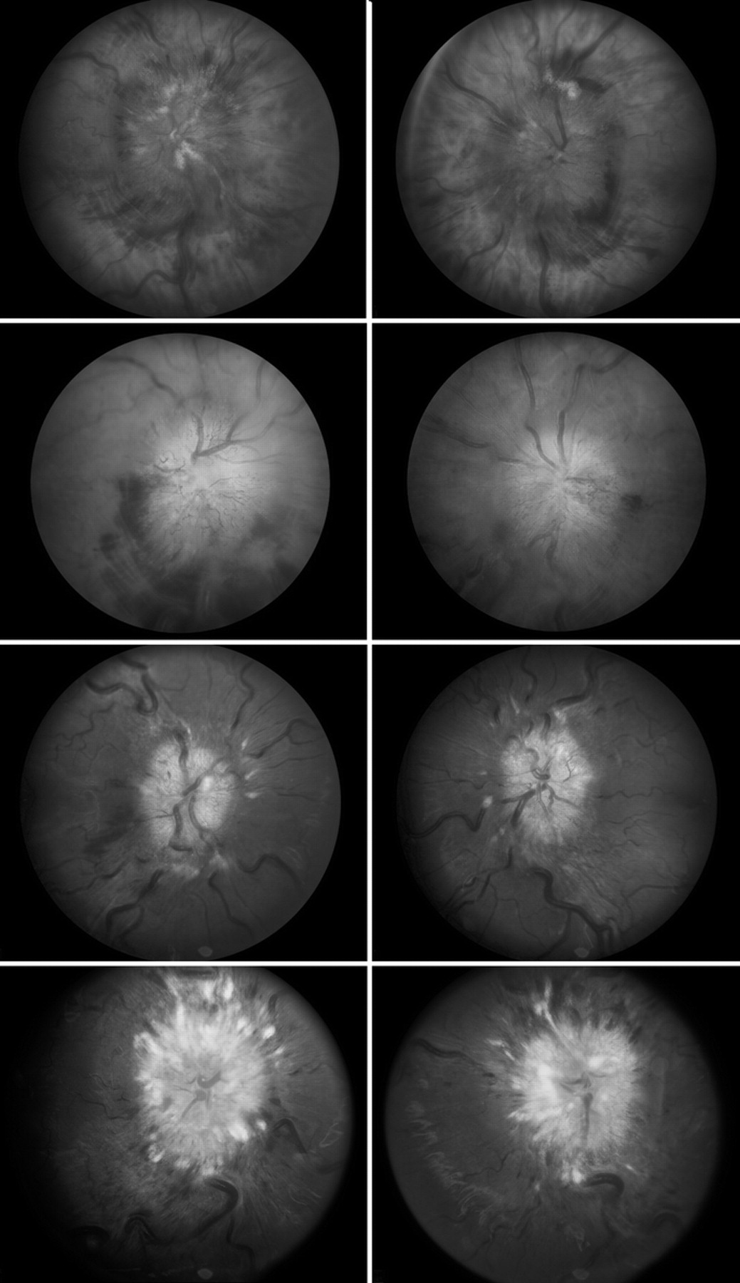严重的视力损失严重,两国双边视神经乳头水肿指出在表示在所有情况下(图1)。正式的视野测试,执行Goldmann视野测试或汉弗莱视野测试,显示严重双边收缩在所有情况下(图2)。第一腰椎穿刺诊断显示执行意味着CSF开启压力的54.1厘米H2O (H范围29到70厘米2O)。