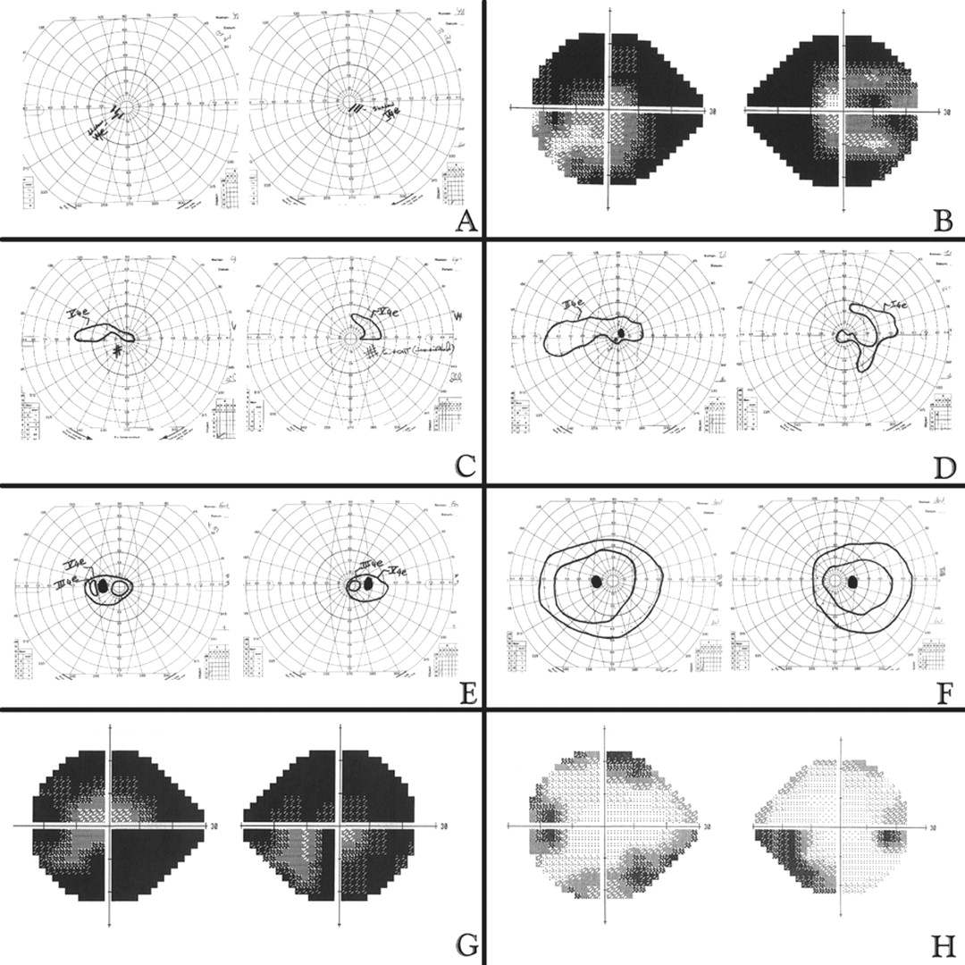 图2。Goldmann和汉弗莱的视觉领域相同的四个重型特发性颅内高血压患者(左边是左眼和右眼右边)。左列(A、C、E, G)显示最初的视觉领域,和正确的列(B、D、F、H)显示了最终的视觉领域治疗后。汉弗莱视觉领域进行24-2悉标准或快速程序。前两个案例(A / B和C / D)是非常有限的好例子改善视觉功能;这两个病人失明。最后两个案例(E / F和G / H)是改善视觉功能的例子,但与狭隘的领域。