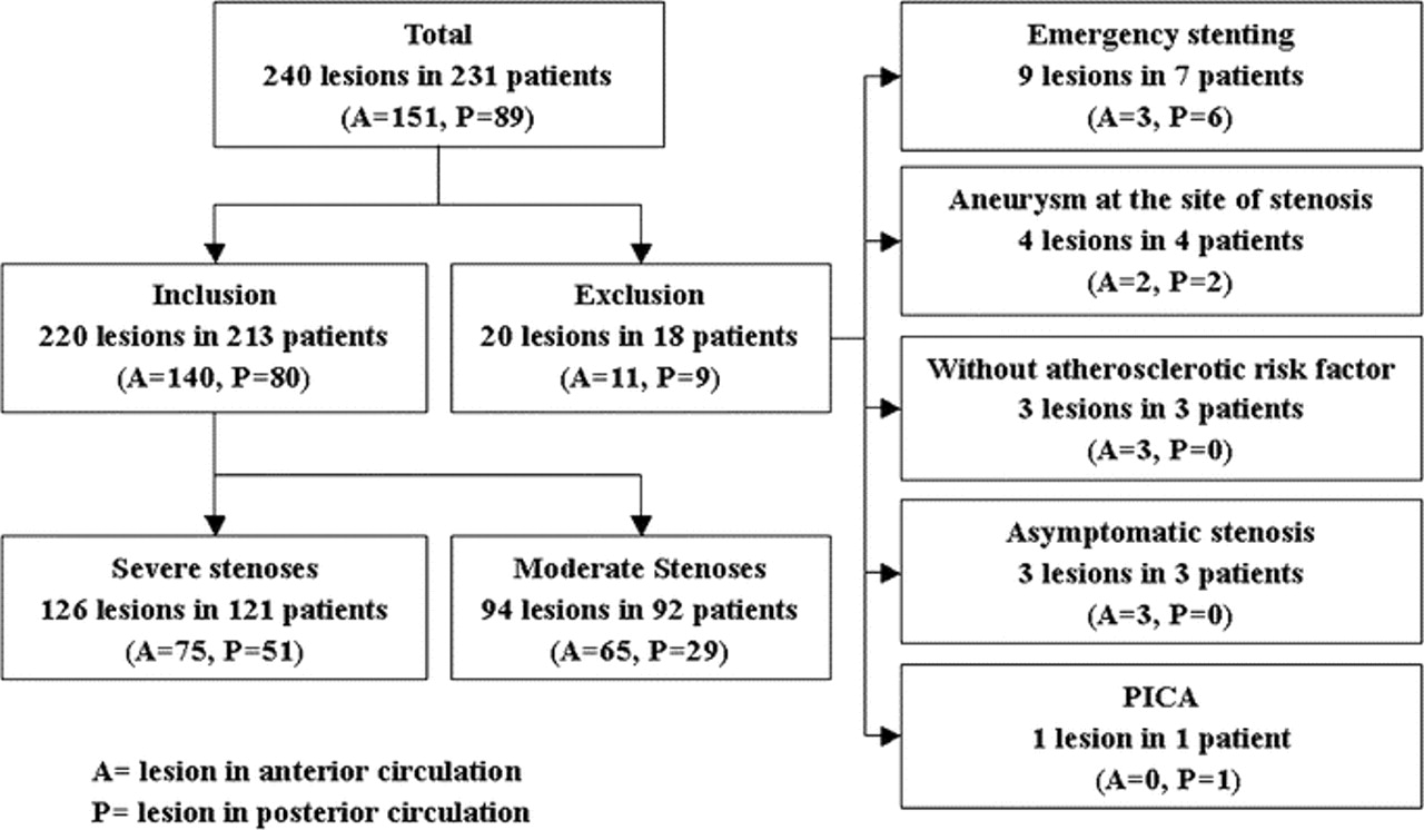 分析的患者被确认在此数据库中收集的231例连续的颅内支架狭窄9月5日之间在我们研究所,2001年6月30日,2005年,随访直到2006年6月结束。数据库前瞻性记录为颅内支架狭窄的结果。关注了解选择性支架在补充免疫活动的影响,损伤被纳入本研究具有以下特点:1)血管摄影证实主要颅内动脉狭窄≥50%(颅内颈内动脉,主的大脑中动脉颅内椎动脉、基底动脉);2)导致缺血性中风或TIA为排位赛事件;3)选择性支架治疗(即。,interval between qualifying event and stenting was at least 24 hours for TIA, 7 days for minor stroke [NIH Stroke Scale score < 9],13、14或6周大中风(NIH卒中量表评分≥9]);和4)与一个或多个相关病人动脉粥样硬化危险因素(高血压、糖尿病、高脂血症、半胱氨酸和吸烟)。病变具有以下特征被排除在外:1)治疗< 24小时从TIA, < 7天从轻微中风,或< 6周大中风;2)同时存在动脉瘤在狭窄的网站;和3)病人没有动脉粥样硬化危险因素有关。这项协议是我们机构伦理委员会批准。写之前获得知情同意的过程。
