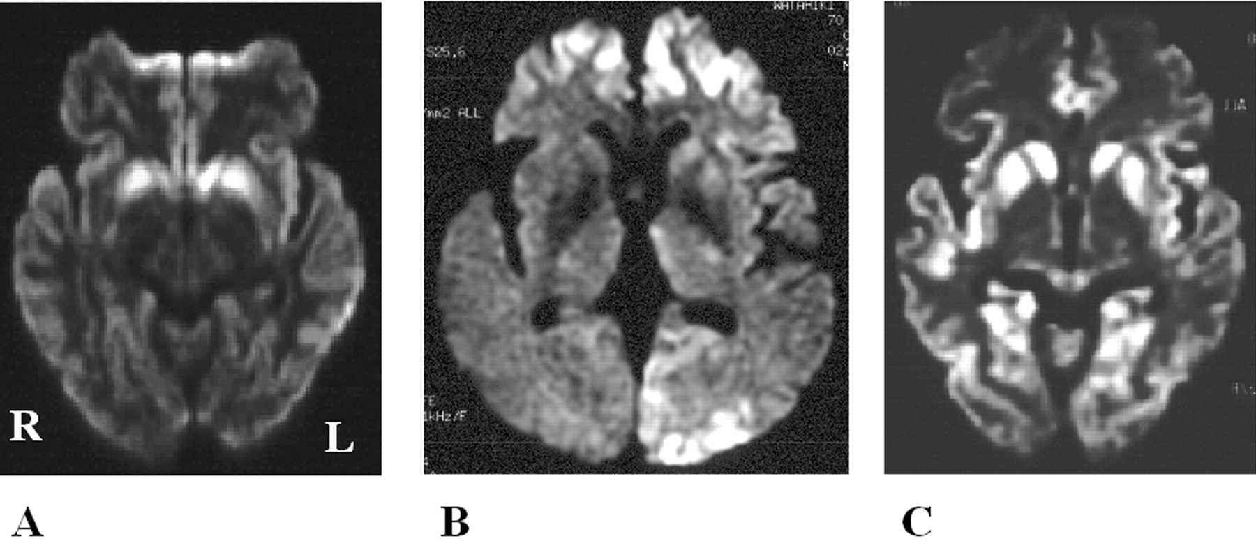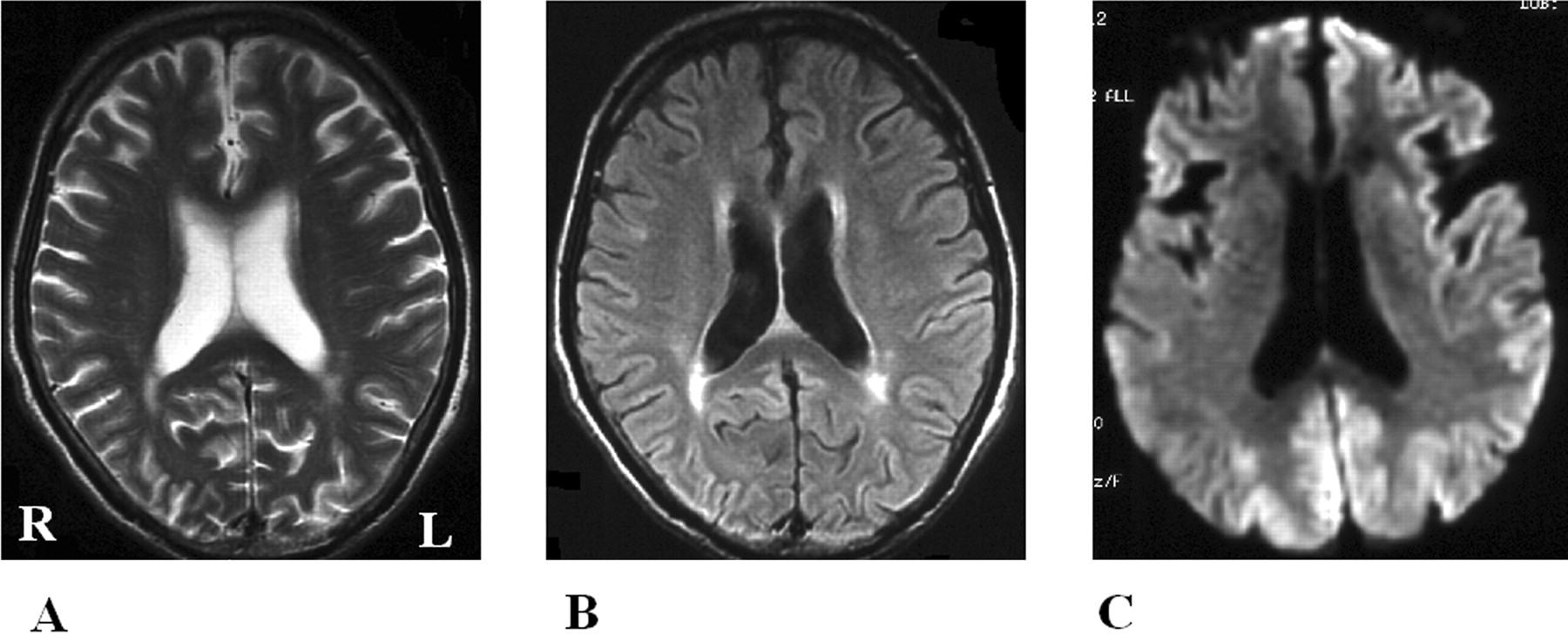 图4。比较显眼的克雅氏病疾病变化相同的病人在不同的核磁共振序列。t2加权成像(A)和fluid-attenuated反转恢复成像(B)显示正常的结果,和diffusion-weighted MRI (C)展示了高强度在大脑皮层病变。