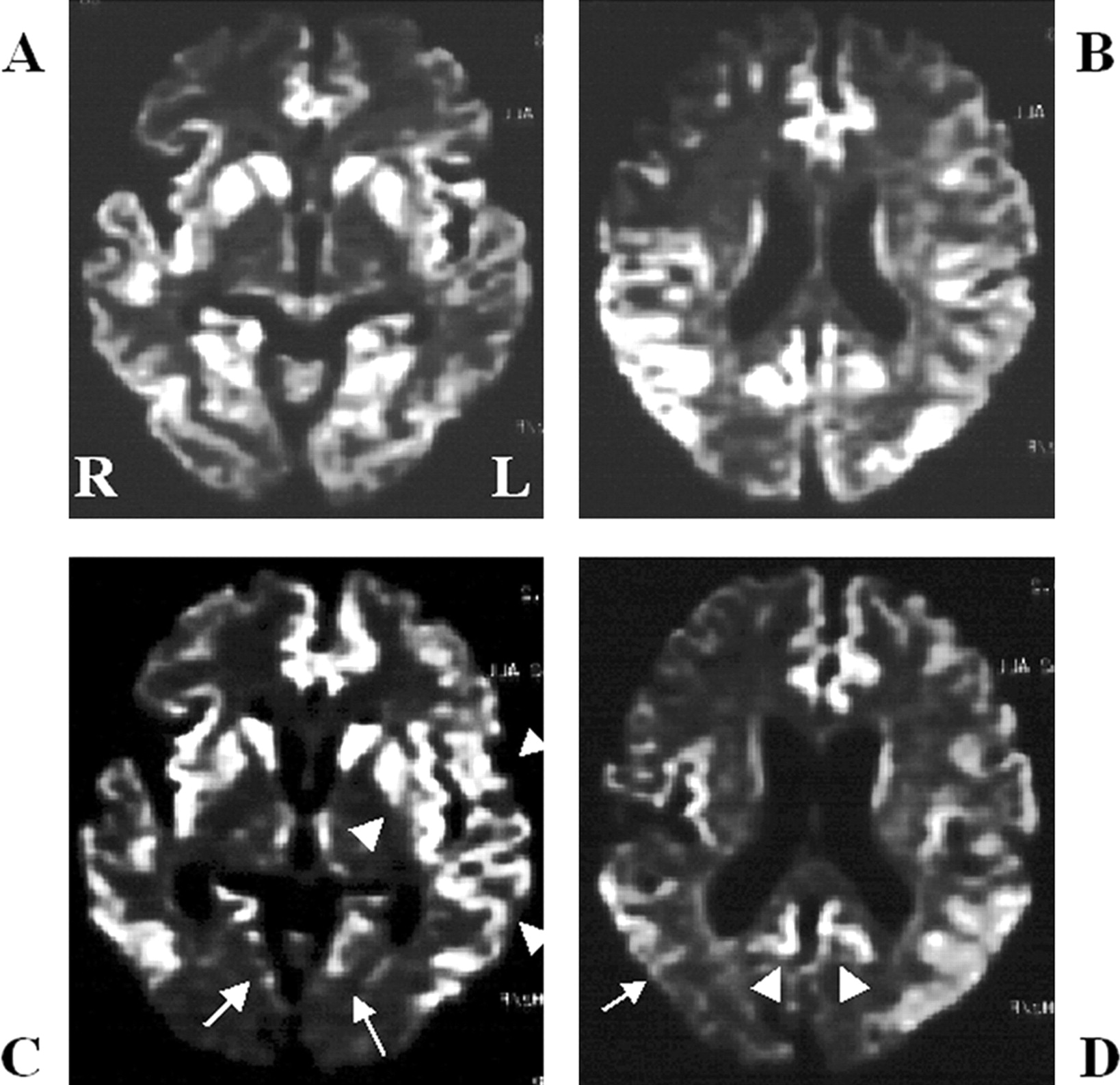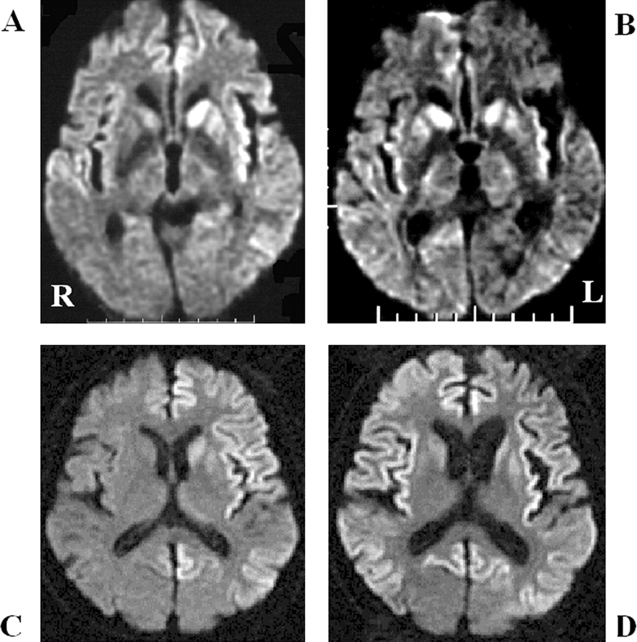 图2。按时间顺序的改变的纹状体和皮质病变。零星的克雅氏病(CJD)显示基底神经节的进展信号变化不对称对称(B) (A)。(A)和(B)之间的间隔是2个月。的家族与V180I突变库贾氏症显示大脑皮层的进展和尾状核头信号变化不对称(C)对称(D)。(C)和(D)之间的间隔是4个月。