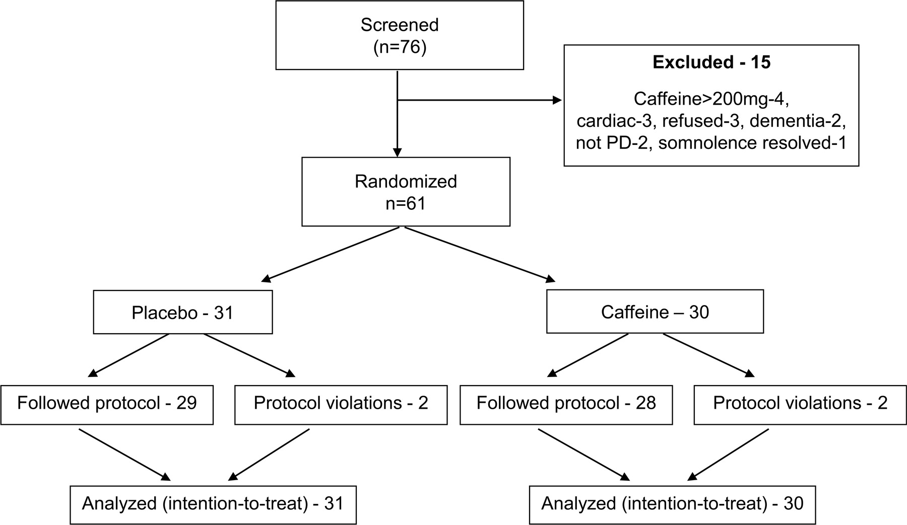 这项研究是原计划之间的交叉试验与四周冲刷期治疗。经过15病人登记,审判是转化为一个与这些相应平行的组织设计,因为过度辍学后在安慰剂组第一阶段(3/8例),因为资助机构(加拿大健康研究所)担心潜在的失败的咖啡因在4周内洗掉。因此剩下的46名患者招募了一批单相并联设计,只有15个交叉的第一阶段的病人进行了分析在这项研究中(所有标准,方法,结果,干预这两款设计是相同的)。