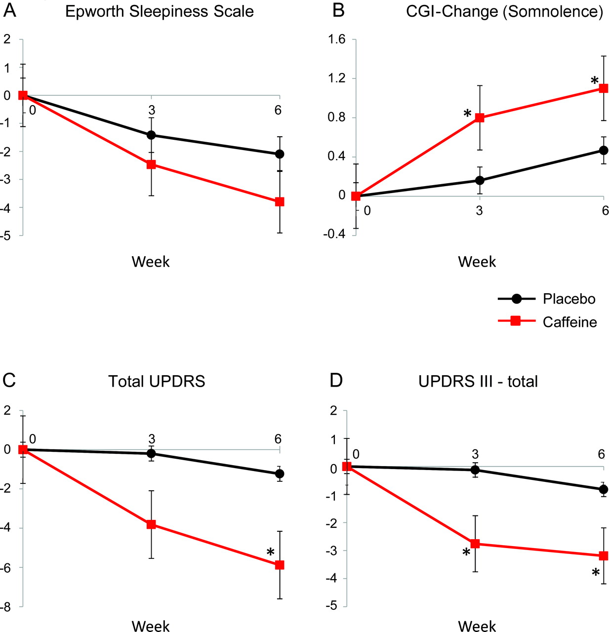 埃普沃思嗜睡量表(一),(B)临床全球印象(CGI) -改改,(C)总统一帕金森病评定量表(UPDRS), (D) UPDRS第三部分。是兴趣的变化主要结果显示咖啡因和安慰剂在六周的审理中。在星期3 = 100毫克咖啡因的剂量,在星期6 = 200毫克。基线值设置为0。误差线指示标准误差。*从安慰剂显著差异,p< 0.05。