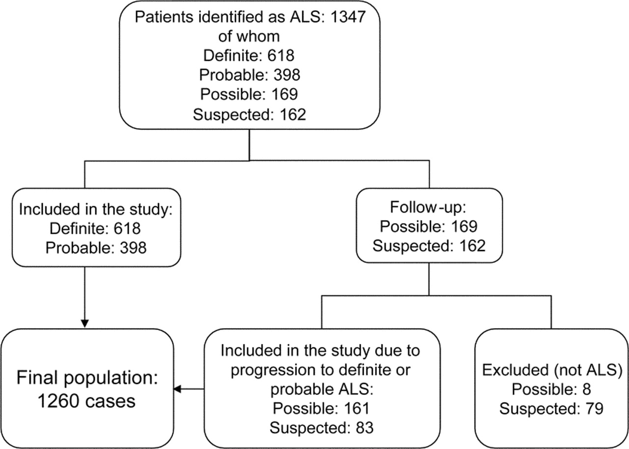 病例的主要来源是神经系统部门的两个地区。在每一个部门,一个或多个调查人员认定为研究指示物。调查人员使用了一种特别的问卷收集病人的人口统计信息、临床历史,神经系统和实验室研究结果,和治疗。诊断肌电图检查是在所有情况下按照标准的程序执行。问卷修订的调查人员协调中心和检查的准确性和完整性。差异是通过与当地调查人员讨论每种情况下解决。从2000年开始,ALS的家族史是系统地收集信息。