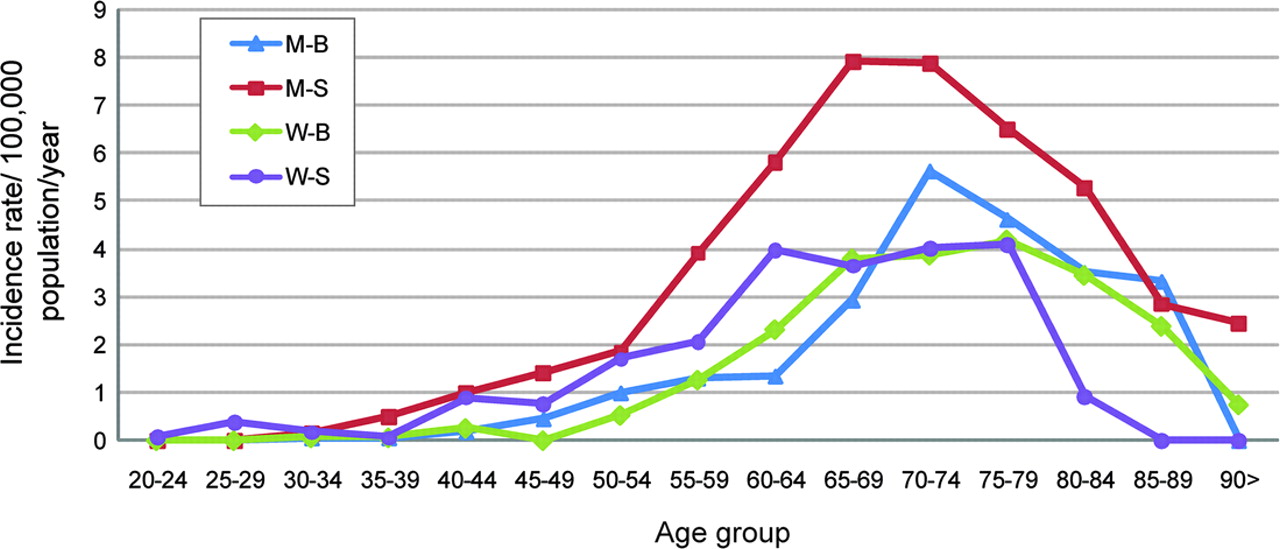 球开始被发现在大约三分之一的病人,这是女性更频繁。当看着各年龄段发病率,男性和女性都充分球出现在所有年龄段的发生率相似。因此,男性高发病率几乎完全是由于脊髓发病患者。女性,各年龄段球发病与发病率的65 - 79年龄段的脊柱出现在最古老的年龄段,甚至更高。这些发现,类似的报道在苏格兰,19表明,老年人患胰腺癌的风险更大的球肌萎缩性侧索硬化症。这种现象可能与不同的参与发病的易感基因ALS的各种临床表现,或球的不同敏感性和脊髓运动神经元在不同的年龄。