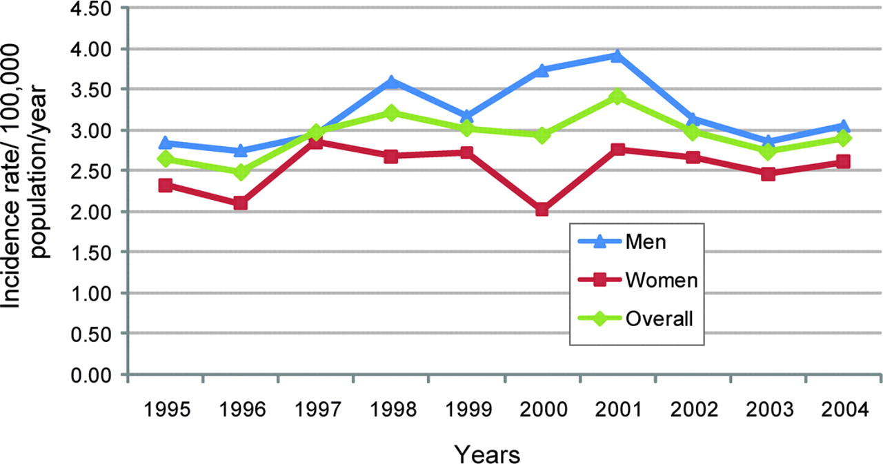 发病率没有任何相关的变异在10年期间的研究(图3)和一直高于男性,女性对男性的比率从1.04(1997年)1.71(2000年)。累积一生患肌萎缩性侧索硬化症是1/278的男性和1/432的女性(表)的军医。