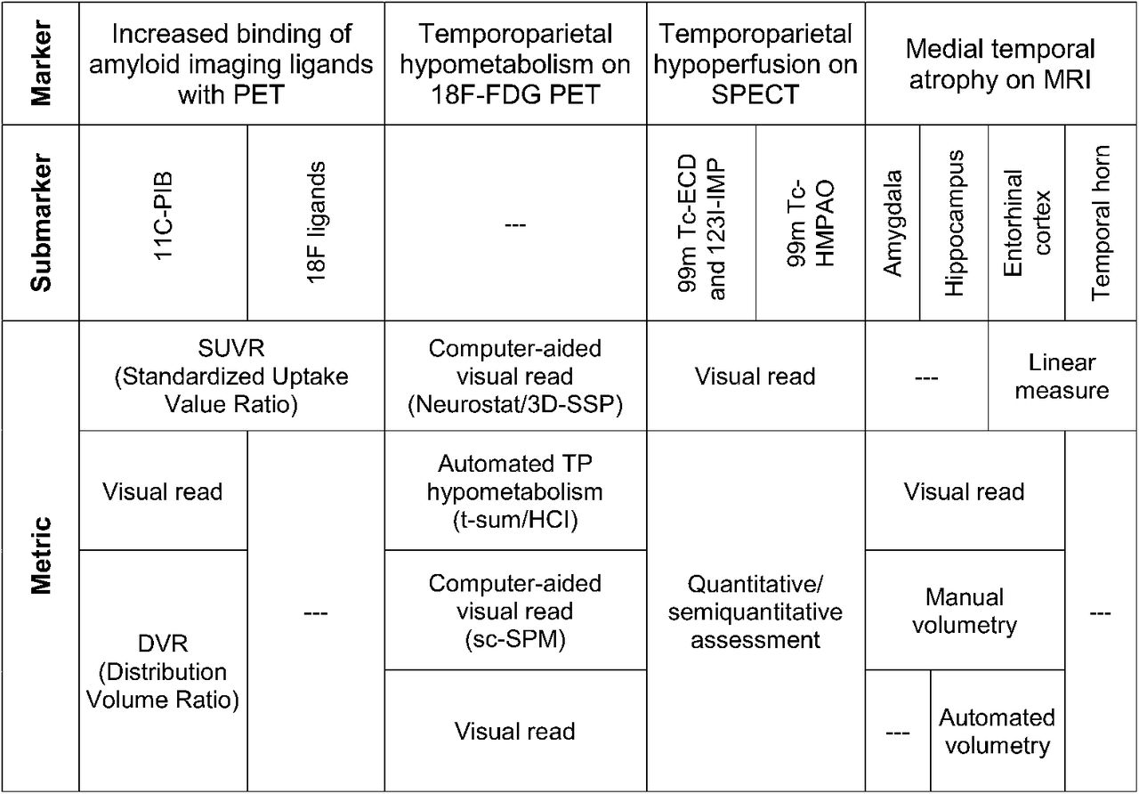 最近收购的病理生理学和自然历史的阿尔茨海默病(AD)领导的研究人员提出替代传统NINCDS-ADRDA诊断标准。国际工作小组1,2和国家Aging-Alzheimer研究所协会(NIA-AA)标准3,- - - - - -,5指定一个关键脑β-amyloidosis致病的作用和神经退化,品质老年斑和神经元缠结在显微镜检查。他们进一步规定,积极在一个或多个疾病标志物的大脑淀粉样变(CSF Aβ42水平降低和增加绑定的淀粉样蛋白与PET显像剂)和神经损伤(皮质颞顶代谢减退18F-fluorodeoxyglucose (FDG) pet或低灌注SPECT,内侧颞叶萎缩在MRI,并增加τ或phospho-tau CSF)与高可能性,患者的认知障碍是由于广告病理学。