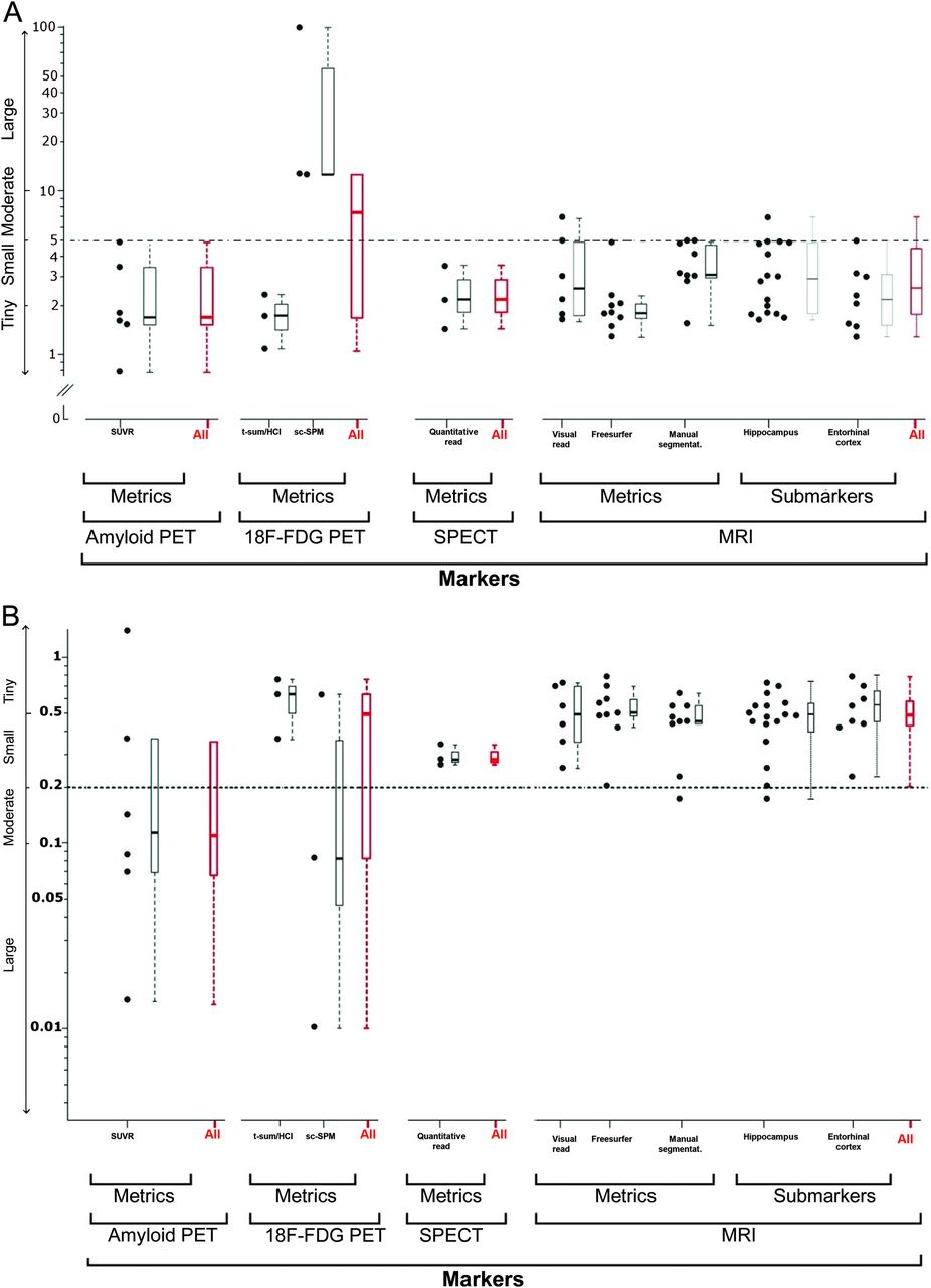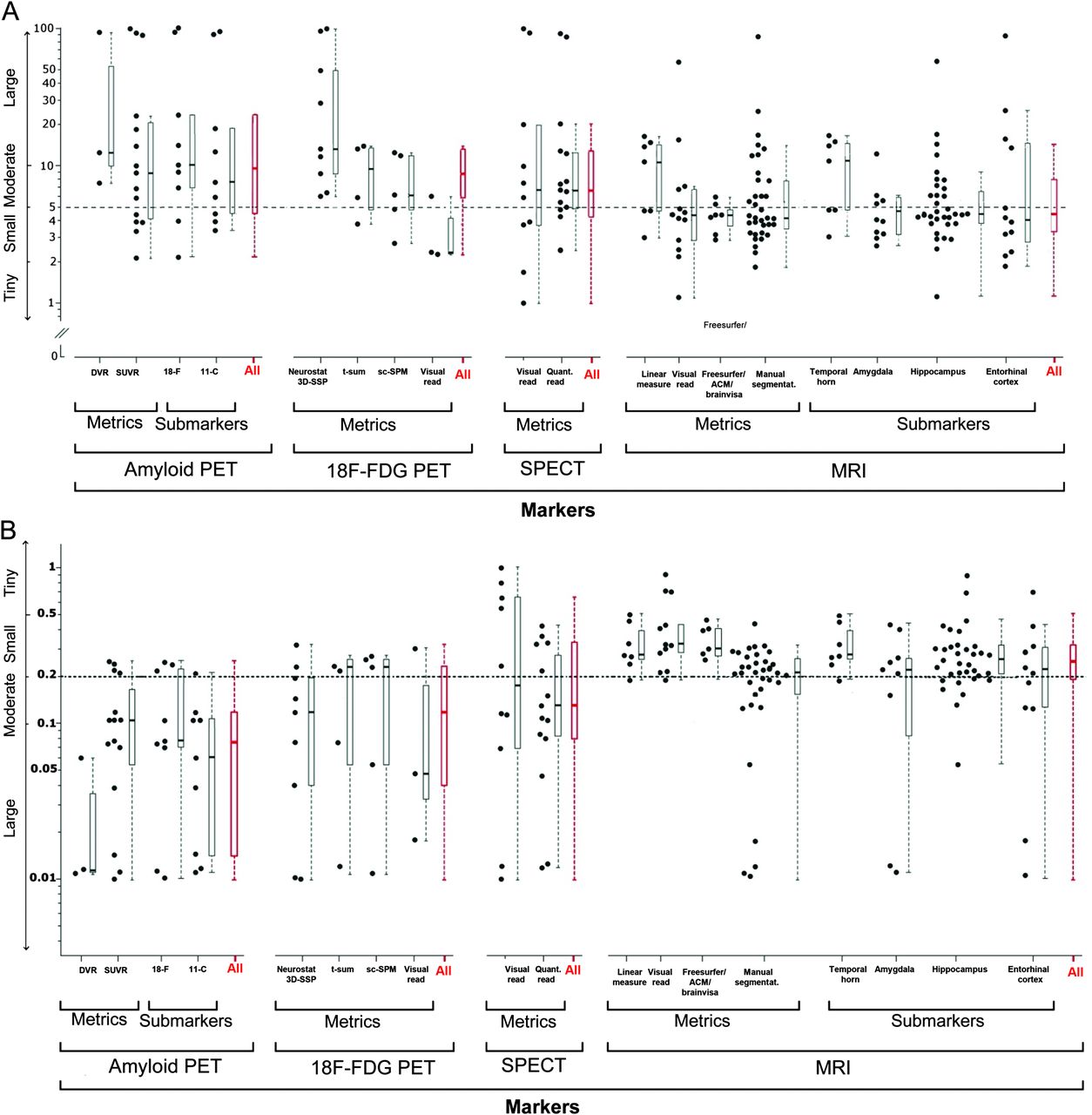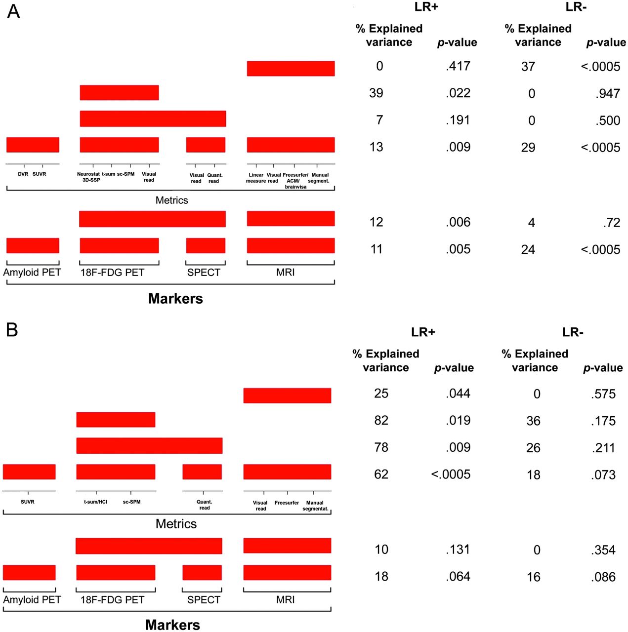 LR的可变性−指标要高得多,尤其是对淀粉样蛋白成像(0.01 - -0.10),和18F-FDG-PET (0.05 - -0.23)。变异指标较低的其他2标记:0.21 - 0.32 (MRI度量),0.13到0.17 (SPECT指标)。有关详细信息,请参见表格e 1。