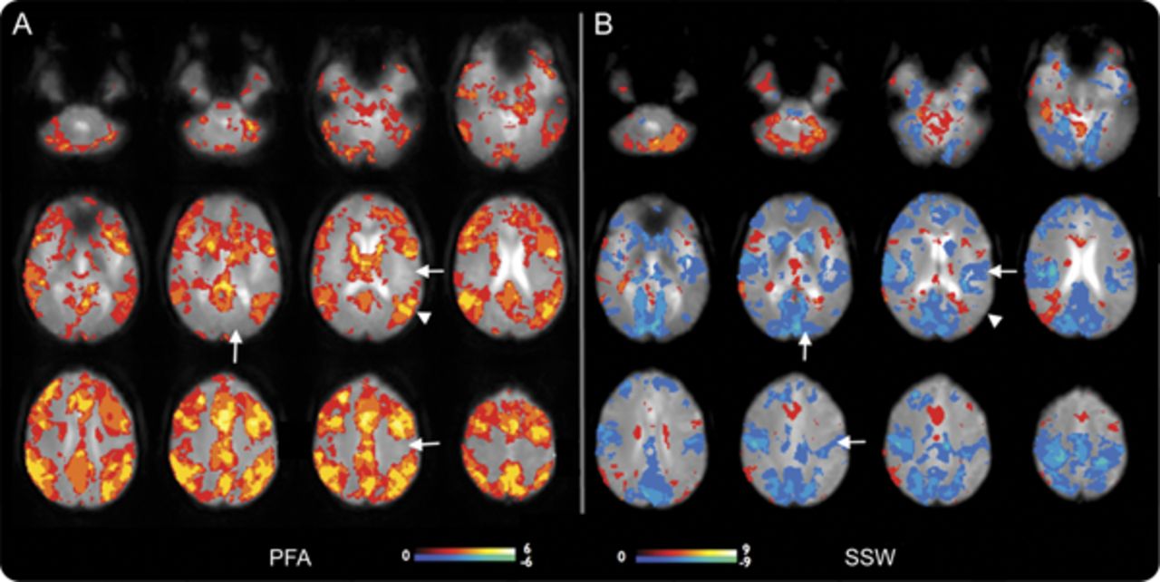 结合阈值SPM PFA的“外显率地图”(A)和(B)西南偏南约显示大脑皮层和皮层下的整体模式的激活和解除激活这些癫痫样的事件。颜色代表对象的数量规模与显著激活体素(黄色高于阈值的像素点为所有6科目PFA和9 f)。增加在大胆的信号显示在暖色和冷色的减少。没有大胆的反应主要在PFA皮质;初级运动、视觉和听觉皮层(箭头)没有激活或不激活体素,而所有这些领域显示减少大胆在f(同样的箭头在B)。在联合皮质(例如,箭头在顶叶皮层)强烈激活在量和没有大胆的在量的变化。这是真的协会地区除了一些地区的额叶皮质显示量的失活。皮层下结构,如脑干和尾状,显示激活量在PFA和失活。尽管个人更多的变化结果与量覆盖所有情况下导致这种识别的模式。大胆=血氧等级相关;PFA =阵发性快速活动; SPM = Statistical Parametric Mapping; SSW = slow spike and wave.