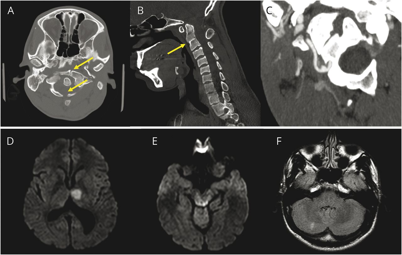 (A) CT颈椎显示C1椎骨不连(箭头)。(B)颈椎CT显示C2-3椎体融合(箭头)。(C)颈部CT血管造影显示右侧椎动脉假性动脉瘤,它从C2横孔出来。(D)扩散加权MRI显示急性左丘脑梗死。(E)扩散加权MRI显示急性背侧中脑梗死。(F)液体衰减反转恢复MRI显示慢性右小脑梗死。