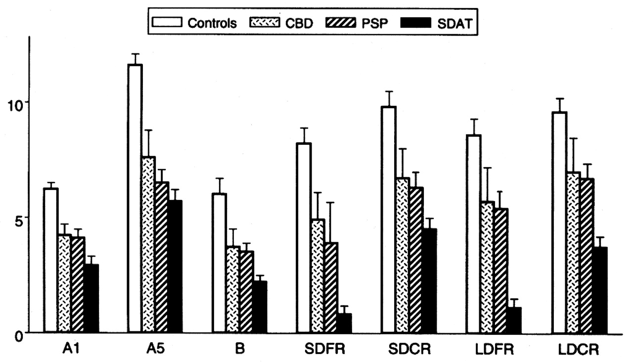 图1所示。加州言语学习测试。性能控制和患者corticobasal变性(CBD),进行性核上的麻痹(PSP)的老年性痴呆和阿尔茨海默氏症类型(SDAT)。A1等于列表审判1;A5等于列表5试验;B =干扰名单B;SDFR =微差自由回忆;SDCR =微差线索回忆;LDFR =延期自由回忆;LDCR =延期线索回忆。 Results are expressed as mean plus minus SEM.
