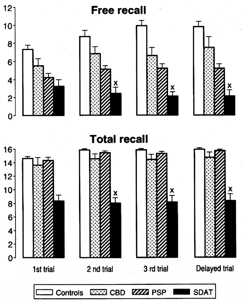 图2。grob和Buschke测试。性能控制和患者corticobasal变性(CBD),进行性核上的麻痹(PSP)的老年性痴呆和阿尔茨海默氏症类型(SDAT)三个试验和推迟审判(从左到右)和自由回忆和宇宙威龙(从上到下)。结果表示为意味着加上- SEM。x = p小于0.05与CBD相比,修正后为多个比较。