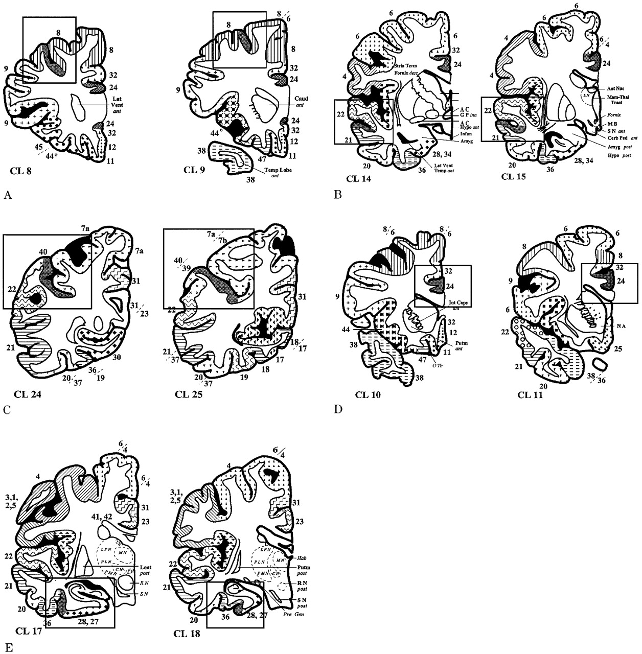 图1所示。轮廓图的冠状切片通过人类大脑描绘Brodmann和中央大脑区域地标:(A)额(额叶中回英航8/9),(B)时间(中间暂时回BA21), (C)顶叶(顶叶小叶英航40),(D)前扣带(BA 24),和(E) transentorhinal(海马旁回英航28)。对于每一个皮层区域,两冠的水平(CL)显示代表推荐的吻侧和尾限制指定区域的采样(灰色舱口)。完整的大脑地图向国家出版辅助服务(午睡)。宏观上可见地标可以帮助识别冠级别:AC =前连合;Amyg =杏仁;Amyg帖子=杏仁后;蚂蚁Nuc =丘脑前核;Caud ant =尾状核前限制;Cerb Ped ant =大脑脚前限制; Fornix desc = fornix descending; G P inn = globus pallidus inner segment; Hypo ant = hypothalamus anterior; Hypo post = hypothalamus posterior; Infun = infundibulum; Int Caps ant = internal capsule anterior limit; Lat Vent ant = lateral ventricle anterior limit; Lat Vent Temp ant = lateral ventricle temporal horn anterior; Lent post = lentiform nucleus posterior limit; Mam-Thal Tract = mammillary-thalamic tract; M B = mammillary body; N A = nucleus accumbens; O Tb = olfactory tubercle; Pre Gen = pregeniculate nuclei; Putm ant = putamen anterior limit; Putm post = putamen posterior limit; R N = red nucleus; R N post = red nucleus posterior limit; S N = substantia nigra; S N ant = substantia nigra anterior limit; S N post = substantia nigra posterior limit; Stria Term = stria terminalis; Temp Lobe ant = temporal lobe anterior limit. Thalamic nuclei (not necessarily visible macroscopically); C N = central nucleus; F N = fasicular nucleus; Hab = habenular; L N = lateral nucleus; L P N = lateral posterior nucleus; M N = medial nucleus; P L N = posterolateral nucleus; P M N = posteromedial nucleus.