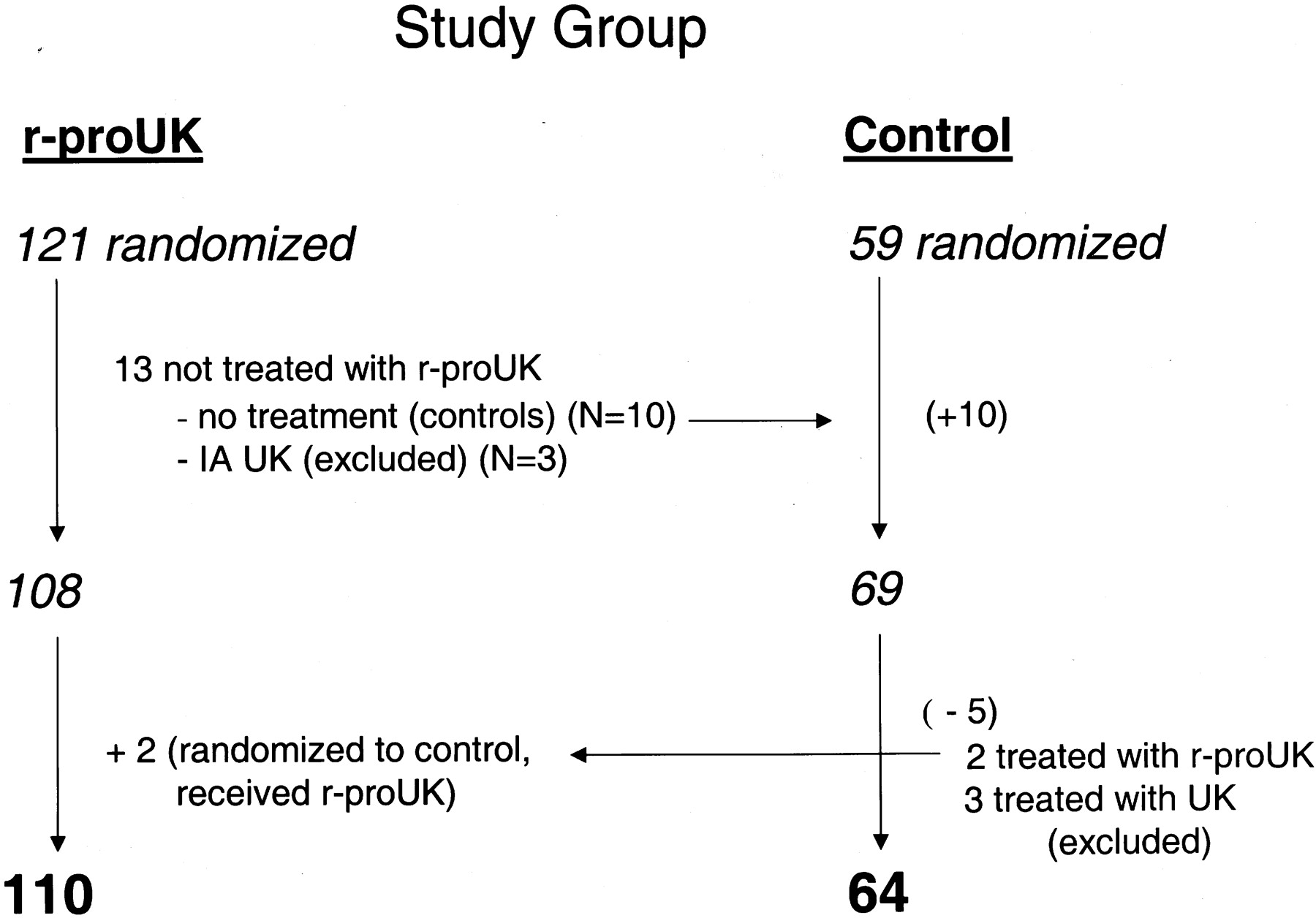 共有180名受试者的试验中,121被随机分配接受r-proUK, 59被随机分为对照组。出于各种原因,13个病人随机r-proUK组没有收到药物(不符合血管造影条件[4];超过6小时窗口[3];由于技术上的困难[2];和极端的风潮,post-angiogram神经恶化,药店错误,和知情同意(分别)不当),而两名患者随机分为对照组收到r-proUK(在两个实例由于药店错误)。三的13个受试者随机r-proUK组未接受药物,还有三个对照组,收到out-of-protocol IA尿激酶和这项研究被排除在分析之外。这导致110名患者接受治疗和r-proUK 64不接受任何溶栓代理(图1)。本研究的重点是r-proUK治疗的病例110例。