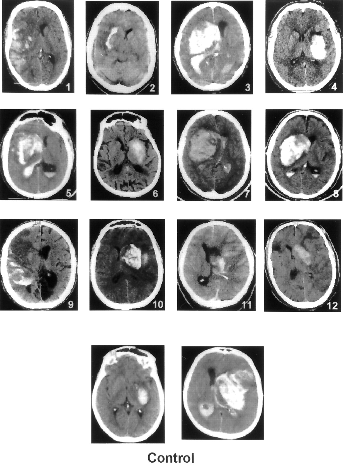 出血症状发生在110年的12个病人(10.9%)接受r-proUK和64年的两个(3.1%)接受静脉注射肝素。这种差异不显著(p= 0.086;相对危险度(RR) 3.5;95%可信区间,0.8 - 31.5)。这些14的CT扫描我的实例所示图2。r-proUK-treated病人的出血与两大支流出血性梗塞(例1、9和11)或大型深半球血肿(例3至8和10),而其他人则相对较小的出血性区域内大型hypodense水肿MCA梗塞分布(例2和12)。所有这些出血发生在前面的梗塞的面积,第一我的症状出现在平均10.2±7.4小时后开始治疗。治疗中风发作的间隔和时间与r-proUK 12出血症状的患者(5.17±0.9小时)不同,剩下的98名患者没有出现出血症状(5.14±0.8小时)。