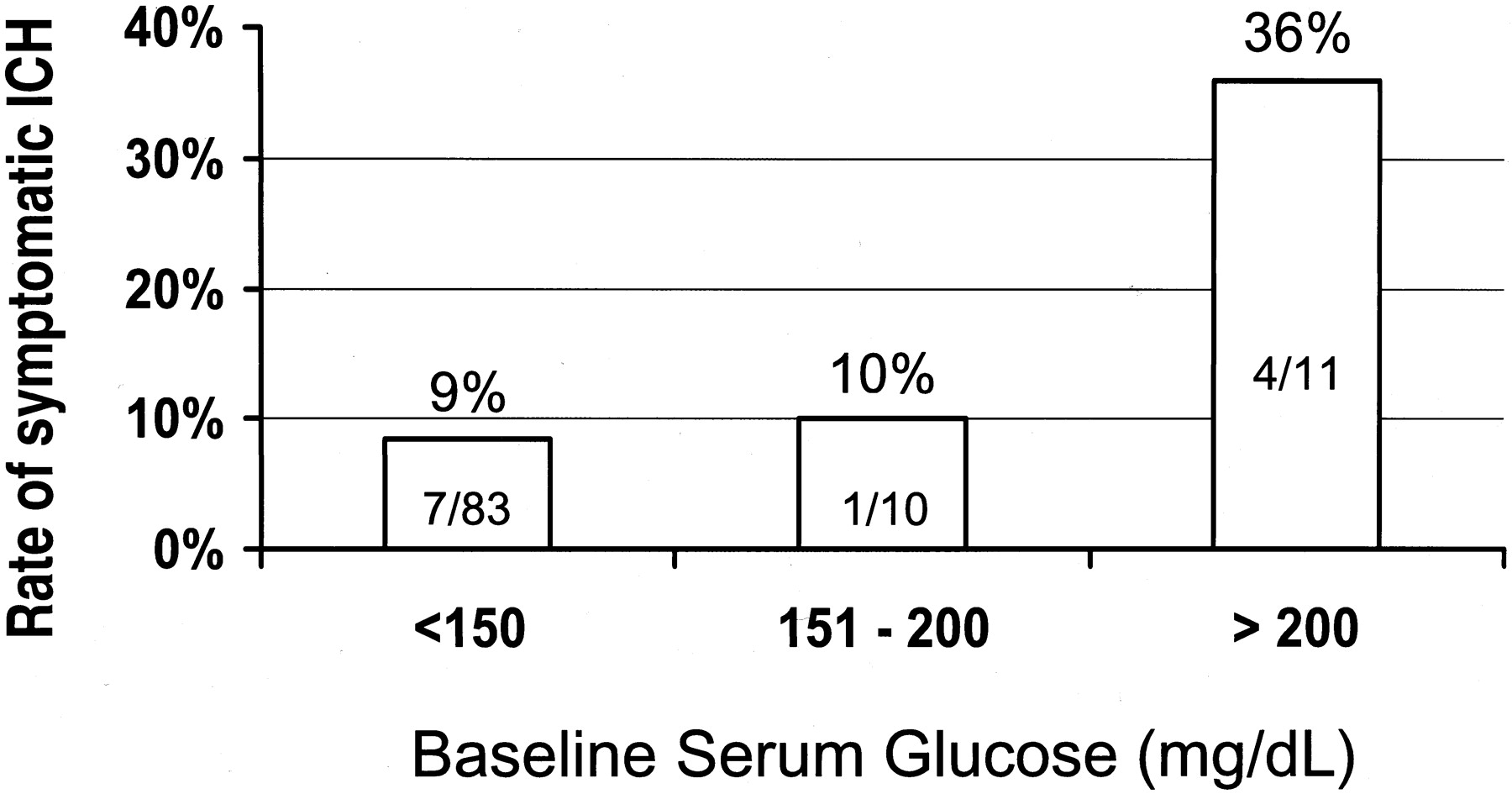 因为只有一个相对强劲的预后变量被确定通过单变量分析,多变量逻辑模型是不必要的。物流模型预测出血症状从血清葡萄糖测量(包括在模型作为定量变量)显示出血症状的几率增加1.3%,体重每增加1 mg / dL血清中葡萄糖。调整基线署得分,预测的风险thrombolysis-related我,1没有改变协会:未经调整的回归系数为0.0128,p值为0.014的物流模式成为了0.0124和0.018,分别调整后的基线署得分。血清葡萄糖分层分类时增加的高血糖水平,这些学科的值> 200 mg / dL出血症状的风险为36% (图3)。