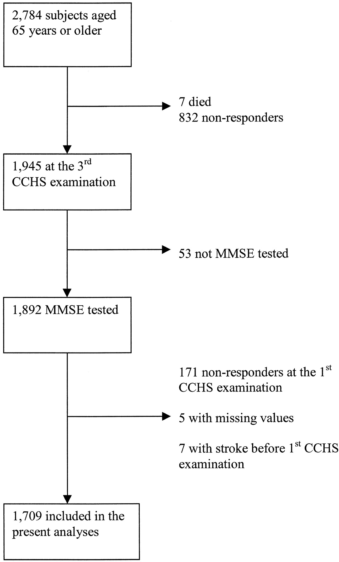 CCHS曾被详细描述。25总之,这项研究是在1976年发起的;19698人生活在哥本哈根市中心(Nørrebro和Østerbro)被邀请参加。第三研究受试者审查考试在1991年到1994年,和那些65岁或更被邀请进行细微精神状态检查(MMSE)。26有2784人在这次考试都是65岁或以上的老人(图)。七合资格参与者死亡,832没有回应记者的邀请,反应率为70.0% (1945/2777)。在53个科目的患者无法评估,因为人不愿意参与(21)或由于严重视力或听力损失,或者因为这个人是失语症患者(32)。因此,1892(68.1%)的最初邀请测试受试者患有先天中枢性换气在第三个考试,其中,277(14.6%)采访了在家里。