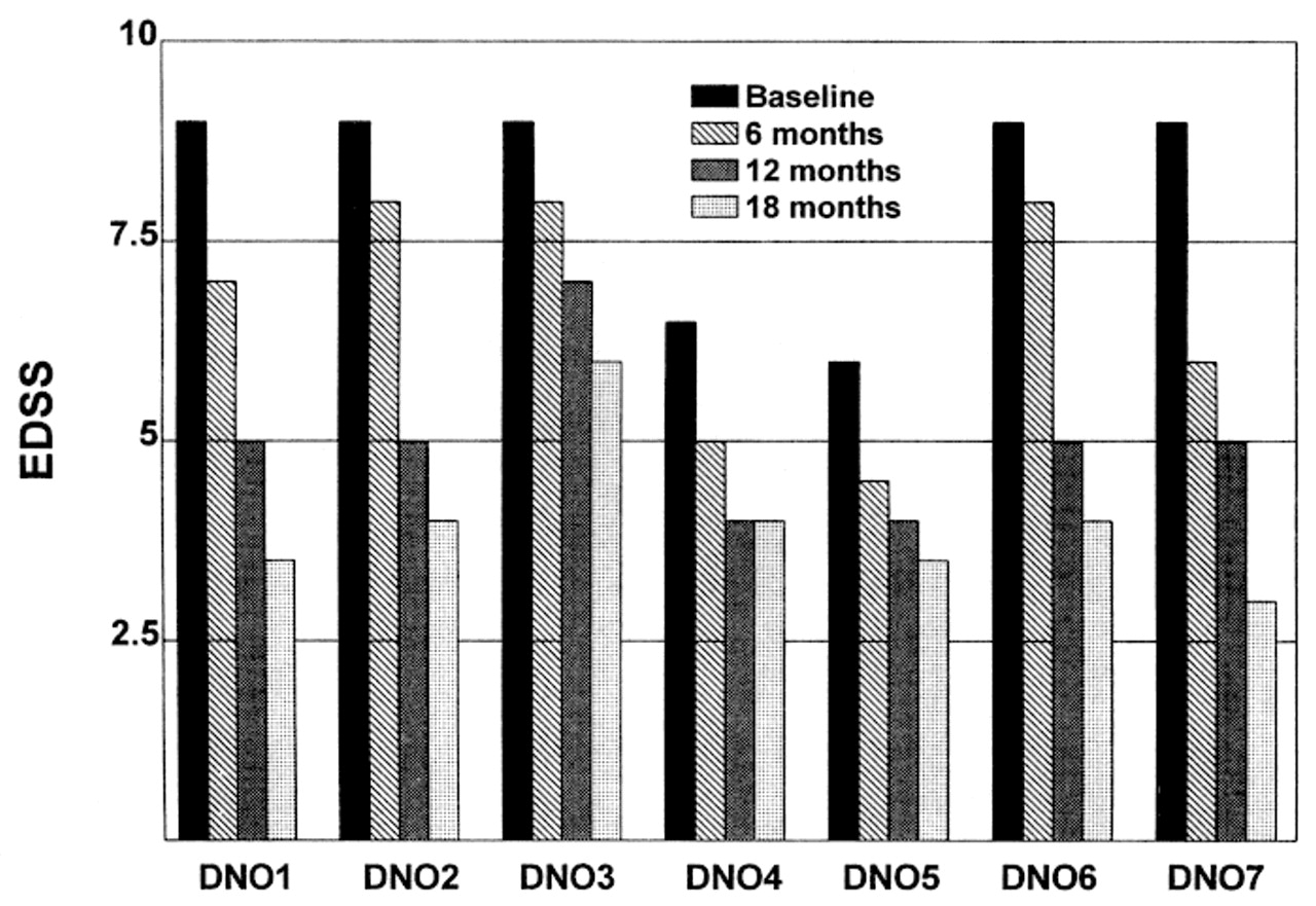 的图显示在基线和eds值在6日12日和18个月的病人。平均基线eds得分为8.2(范围6.0 - 9.0),表明严重的残疾,体现在大多数病人视力严重障碍加上截瘫,无法导航从椅子到床上,以及肠道或膀胱功能的损失。在6个月平均eds分数提高至6.6(范围4.5 - 8.0;p< 0.001),反映在大多数病人导航的能力,恢复括约肌控制,和行走能力的援助。在12个月的患者持续改善,平均eds得分为5.0(范围,4 - 7.0;p< 0.0001)。这些患者能够走动援助和最好括约肌控制。视力也明显改善。最后,在18个月,eds成绩进一步提高,平均4.0(范围3.0 - 6.0;p< 0.0001)。大多数患者可以走动,没有援助,读好,,除了轻微的尿紧迫感,有满意的括约肌控制。值得注意的是,在18个月的随访期间,没有病人急性复发、加重,或新的神经症状。恢复前12个月的移动和愿景。例如,病人1的左视力20/200,四肢瘫痪。12月的视力改善,20/40,她可以走路用最小的援助。值得注意的是,形成空洞信号出现在颈椎MRI在6个月内解决。类似的决议先生在宫颈病变发生在两个额外的病人。