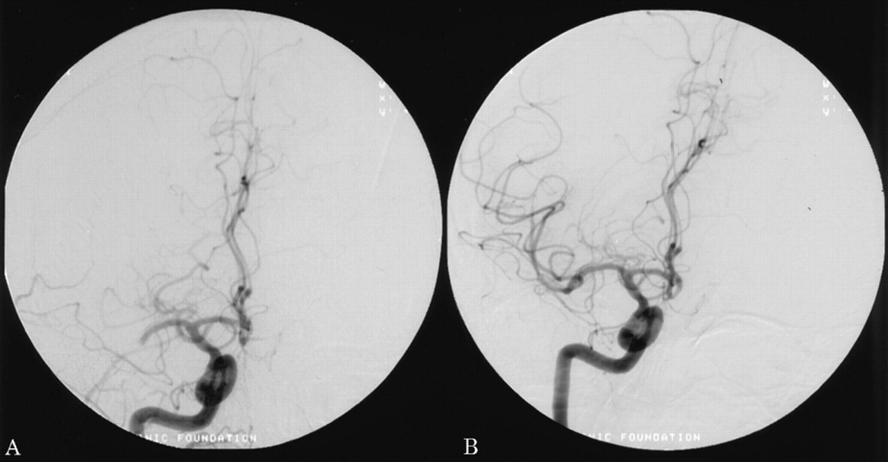 一个63岁的男人有权利M1大脑中动脉(MCA)闭塞后13天紧急冠状动脉旁路移植(CABG)对急性心肌梗死。心房扑动转换药物的前一天。他左半身不遂,视野受损的感觉在他的四肢。他最初的美国国立卫生研究院的中风尺度(署)得分是15。头部CT是正常的。被注入尿激酶200000台60分钟直接进入症状出现后血栓4小时。有良好的近端血管再通残余填充缺陷在某些M3分支(图1)。尽管国际标准化比率(INR) 1.4当天早些时候,重复INR立即过程是4.8之前完成。他得到10毫克维生素k IV肝素溶栓后开始2天。他开始他的左后立即手术。他只有一个提示视觉忽视在6周,是神经正常的病人在8个月。