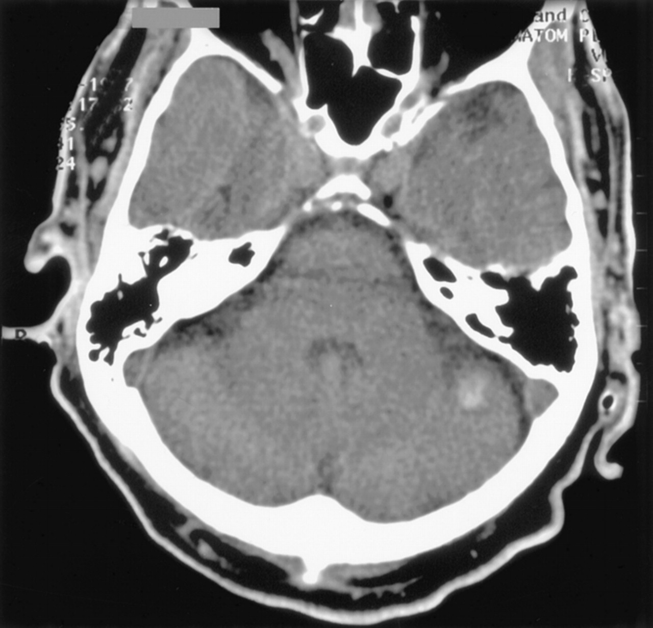 一个76岁的老人有着悠久历史的冠状动脉疾病有M1 MCA闭塞冠脉搭桥术后2天。头部CT显示,没有证据表明急性缺血性梗塞或出血。他最初署得分19岁与全球失语症和右半身不遂。四个小时从症状出现,tPA 25 mg注入超过90分钟到血栓恢复只有最小流。头部CT做1天0.5 cc溶栓后显示无症状左小脑出血(图2)。静脉注射肝素溶栓后开始3天。他没有收到任何输血,尽管他在5天内从38比容下降到20%。署的分数在7天内提高11。出院时11 postprocedure天,他能够遵循简单指令但说只有单音节的词。右侧力量改善了4级(0到5医学研究委员会规模)在手臂和4.5的腿。在5个月他继续有一个明显的迟滞型失语症但能够独立执行最活动的日常生活。