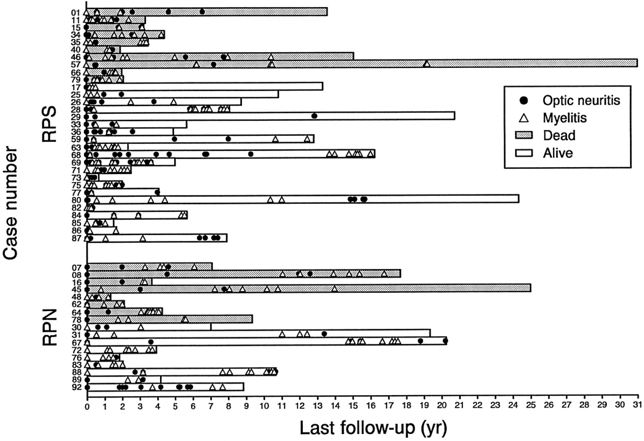 结果:动是单相或复发。单相课程(n = 23)患者通常提供快速顺序索引事件(平均5天)和温和复苏。最具有复发(n = 48)有一个扩展指数事件之间的间隔(平均166天)后3年内的集群严重复发孤立的视觉神经和脊髓。大多数复发患者严重的残疾在逐步的方式开发,和三分之一因呼吸衰竭死亡。动有别于“典型”的特点包括女士> 50个细胞/毫米3CSF(通常是多形核的),正常的初始大脑核磁共振,病变扩展在三个或三个以上椎段脊髓磁共振成像。