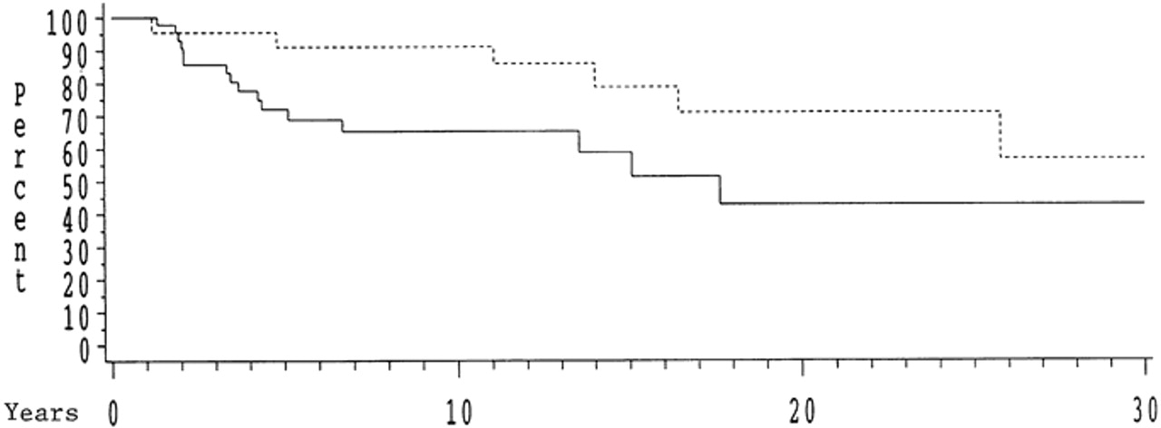 呼吸衰竭引起的急性颈椎骨髓炎发生19次在16个复发患者(33%),只有两次2单相病人(9%)。两个单相病人康复。十五16复发的患者(93%)呼吸衰竭死亡;3只恢复从第一集屈从于另一个。5年生存率(图3在单相集团)是90%,68%复发组(p= 0.06)。复发组的死亡都是由于呼吸衰竭。