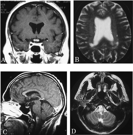 图4。选择先生大脑的图像。(A)扩散增强视神经交叉的gadolinium-enhanced t1日冕图像。(B)几室周的病变中看到一个病人在t2加权图像轴。(C和D)损伤扩展的吻侧颈绳在髓质gadolinium-enhanced t1矢状轴向和t2加权图像。