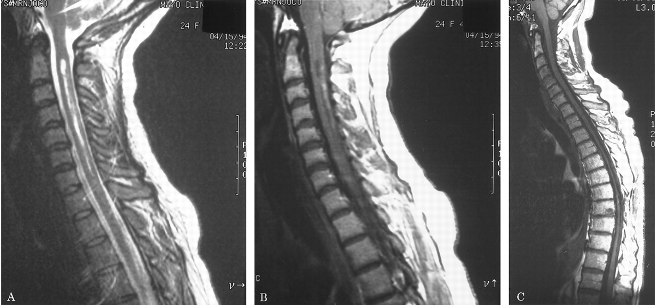 23复发患者共50脊髓磁共振表现在8周内发病的骨髓炎的情景;47 50(94%)不正常。44 50(88%)、纵向、融合性的损伤扩展在3或更多(通常是6到10)椎段(图5)。索肿胀(25/50扫描,50%)和钆增强(32/50扫描,64%)通常观察到。五23例(22%)与后续线成像发达焦线萎缩。