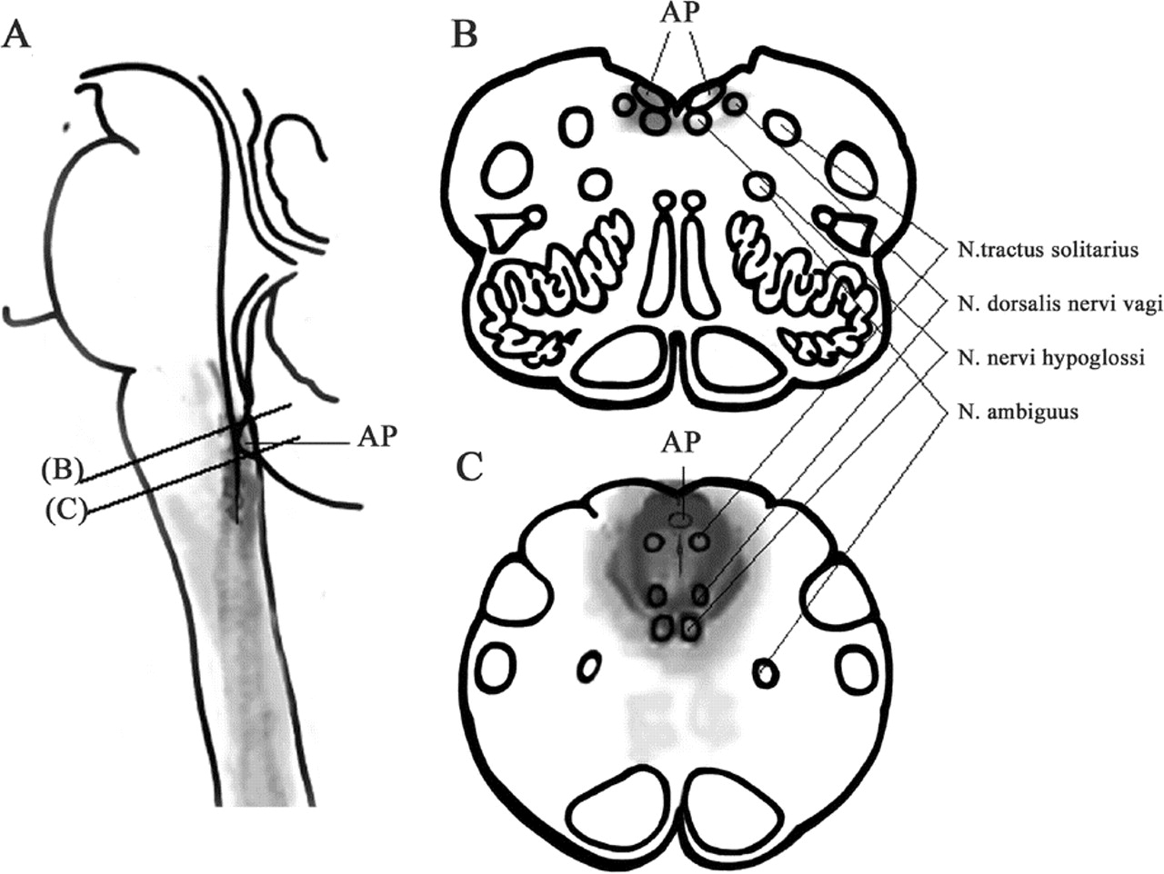 打嗝、恶心和呕吐被认为是造成的损伤涉及背内侧髓质包括美联社和nt和腹外侧的呼吸中枢(VRC)如细胞核ambiguus,虽然症状的神经网络及其病理生理的关系在人类还没有完全理解。缺乏腹外侧病变在我们动情况下表明他可能来自美联社和nt或预测从nt VRC受到炎症刺激。