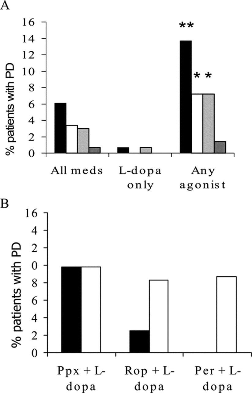 图。(A)比例的帕金森病(PD)患者病理性赌博、性欲亢进,强迫性购物、或任何强迫行为在左旋多巴,受体激动剂单药治疗或辅助受体激动剂。黑条,任何行为;白色的酒吧,病理性赌博;浅灰色酒吧,性欲亢进;深灰色的酒吧,强迫性购物。* * * p < 0.001, p < 0.0001 vs PD患者左旋多巴的单方行为。(B)比例的PD患者性欲亢进根据辅助多巴胺受体激动剂的使用。黑条,病理性欲亢进(7);白色的酒吧,病理和亚综合征性欲亢进(11)。